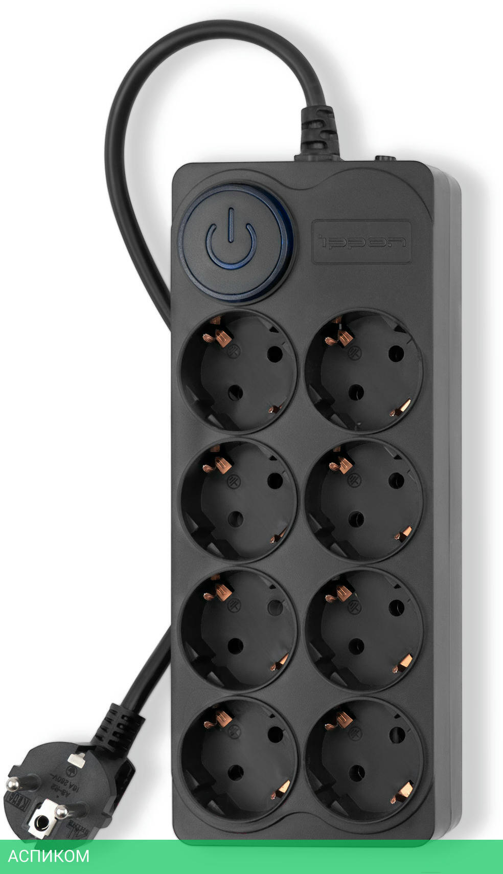8 евророзеток с заземлением. Входная вилка Schuko. Защита от перегрузки. Защита от импульсов высокого напряжения. Защита от перетирания провода в месте входа в корпус фильтра. Ударопрочный негорючий корпус. Кнопка питания с индикатором сети.