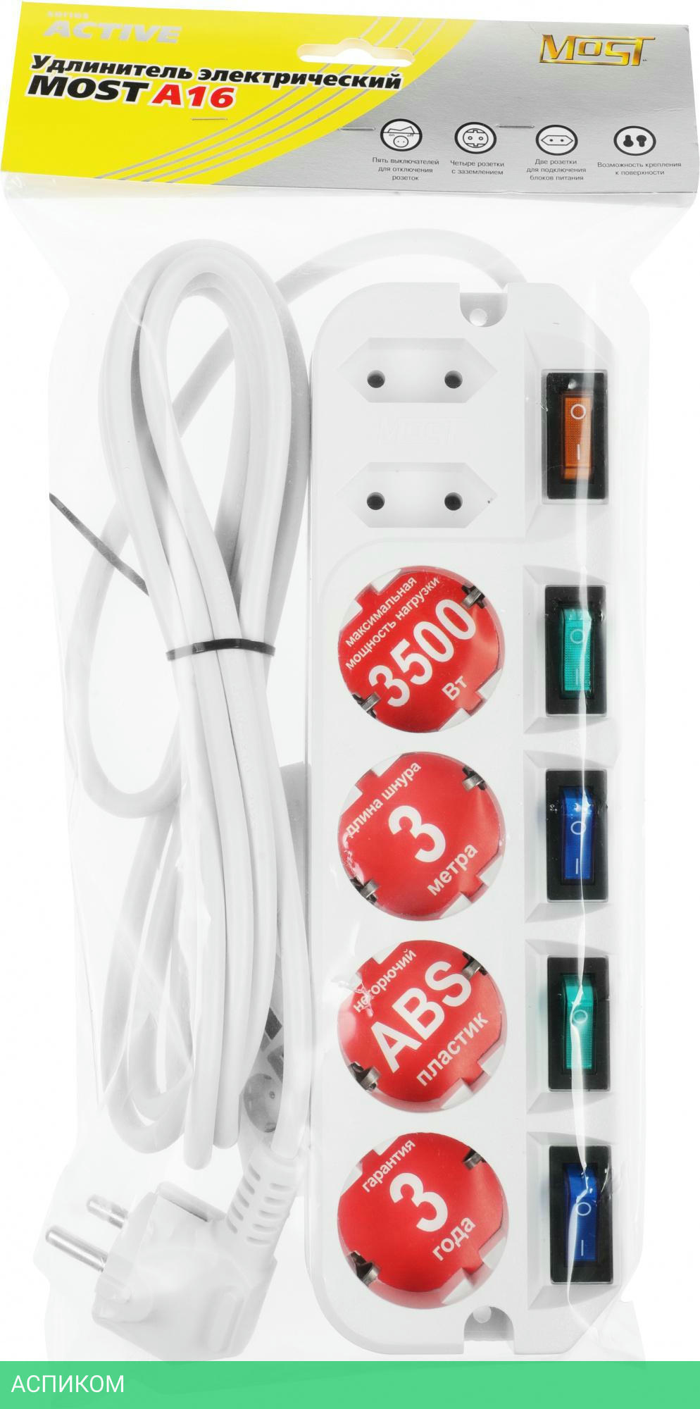 Удлинитель Most А16 предназначен для подключения бытовой техники к сети электропитания. У каждой из четырех евророзеток имеется мощный (16A) индивидуальный выключатель,который обеспечивает удобство обращения с электропитанием и экономит Ваше время. Две узкие розетки имеют общий выключатель.