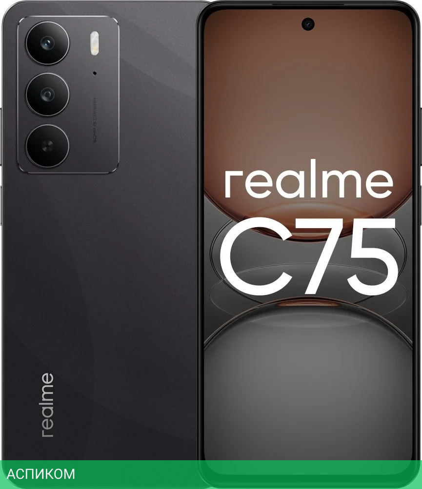 Смартфон Realme C75 8GB/128GB Storm Black (RMX3941)/IPS/6.72″/1080x2400/Android 14/8 ГБ/128 ГБ/MediaTek Helio G92 Max/8 (2+6) Core/50Mpx f/1.8/8Mpx f/2.0/2 nano-SIM/802.11ac (Wi-Fi 5)/2G, 3G, 4G (LTE)/Bluetooth 5.0/USB Type-C 2.0/Fingerprint/GPS, ГЛОНАСС, BeiDou, Galileo/Storm Black/IP68, IP69/6000 mAh/165.69mm/76.22mm/7.99mm/196g