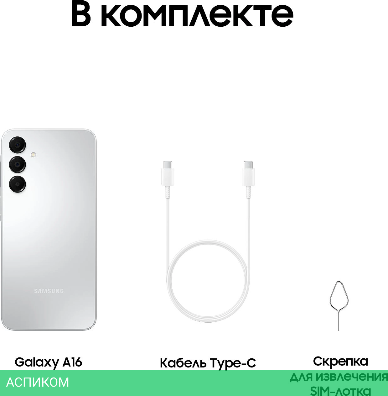 Смартфон Samsung Galaxy A16 4/128Gb SM-A165F серебристый (SM-A165FZADCAU)/AMOLED/6.7″/1080x2340/Android 14/4 ГБ/128 ГБ/Mediatek Helio G99/8 Core/50Mpx f/1.8/13Mpx f/2.0/2 nano-SIM/802.11ac (Wi-Fi 5)/2G, 3G, 4G (LTE)/Bluetooth 5.3/USB Type-C/Fingerprint/GPS, ГЛОНАСС, BeiDou, Galileo, QZSS/Silver/IP54/5000