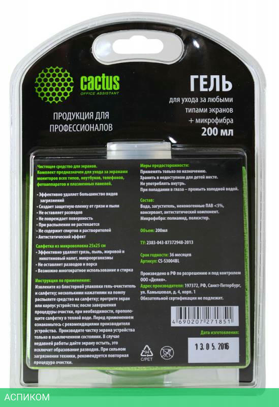 гель 200 мл + салфетка из микрофибры для экранов 200x230 мм