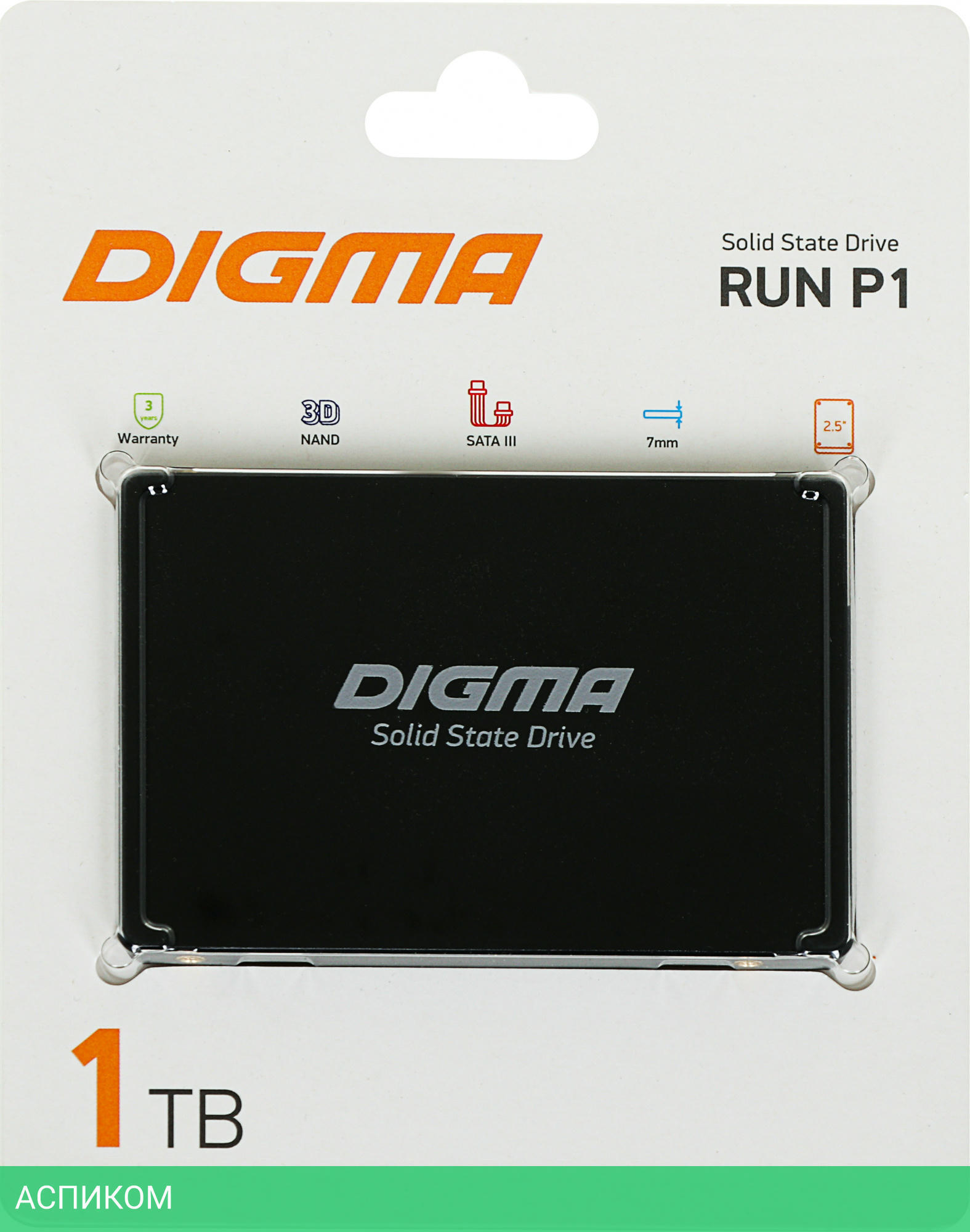 SSD диск Digma 2.5" SATA III 1Tb Run P1 (DGSR2001TP13T)/2.5"/1 ТБ/SATA 3.0 (6Gbps)/500MBs/400MBs/76K IOPS/74K IOPS/2M MTBF/3D TLC NAND/RTL
