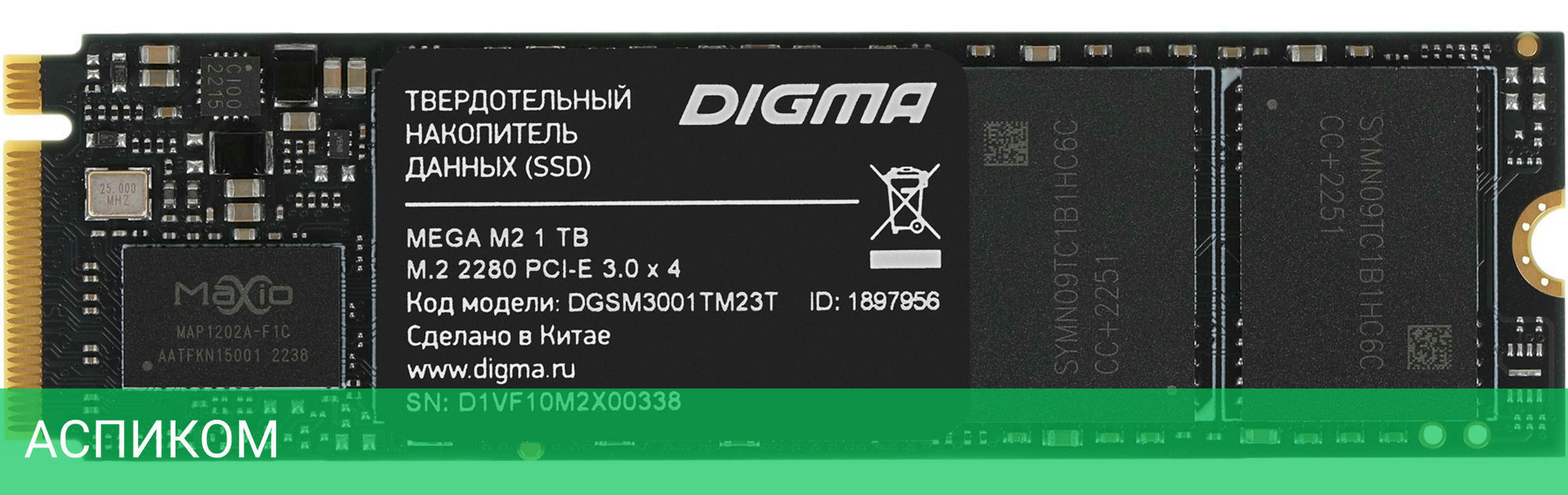 SSD диск Digma Mega M2 1TB (DGSM3001TM23T)/M.2/1 ТБ/PCI Express 3.0 x4/3300MBs/3100MBs/1.5M MTBF/3D TLC NAND/RTL