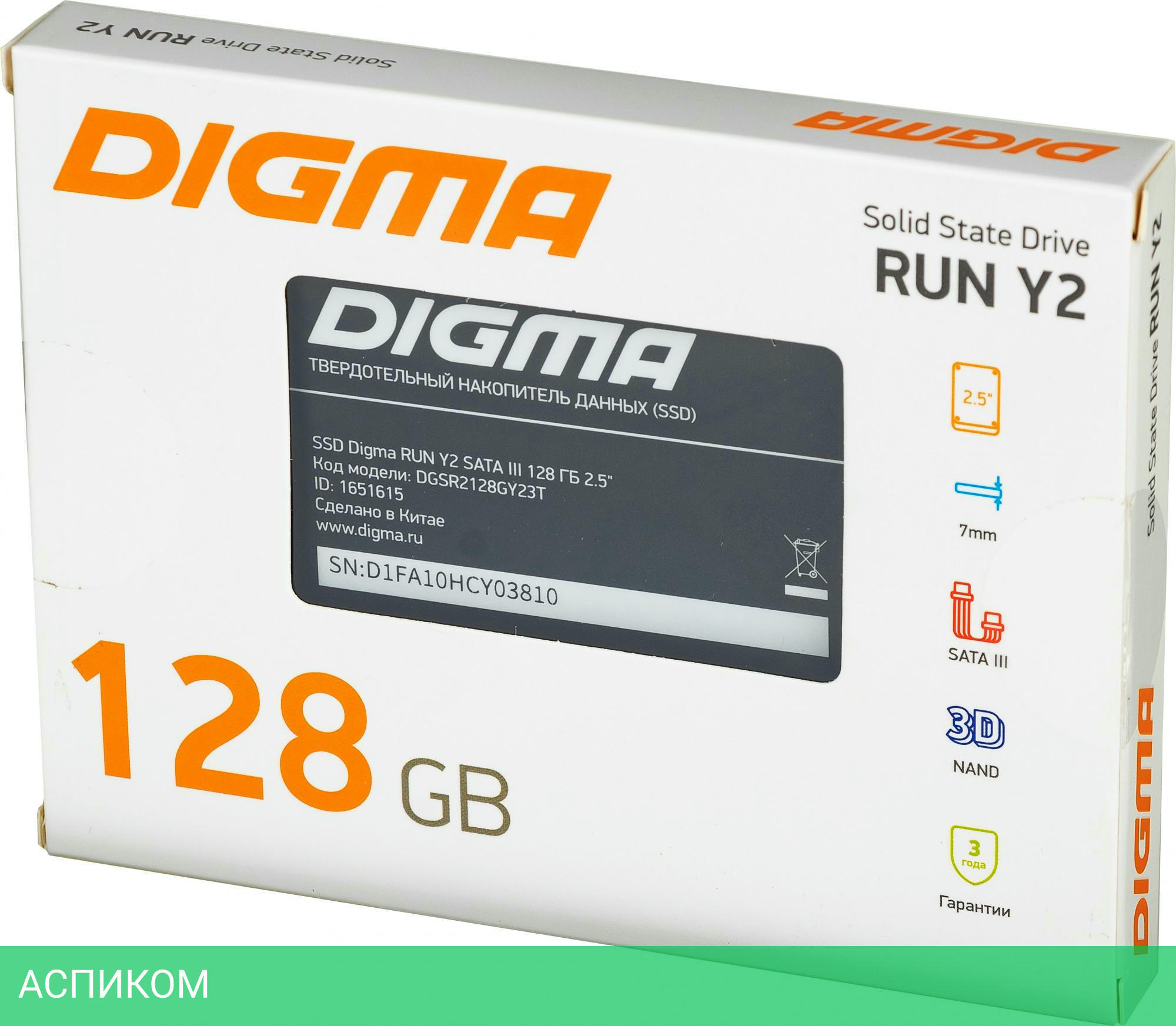 SSD диск Digma Run Y2 128Gb (DGSR2128GY23T)/2.5"/128 ГБ/SATA 3.0 (6Gbps)/530MBs/510MBs/1.5M MTBF/3D TLC NAND/960TBW/RTL