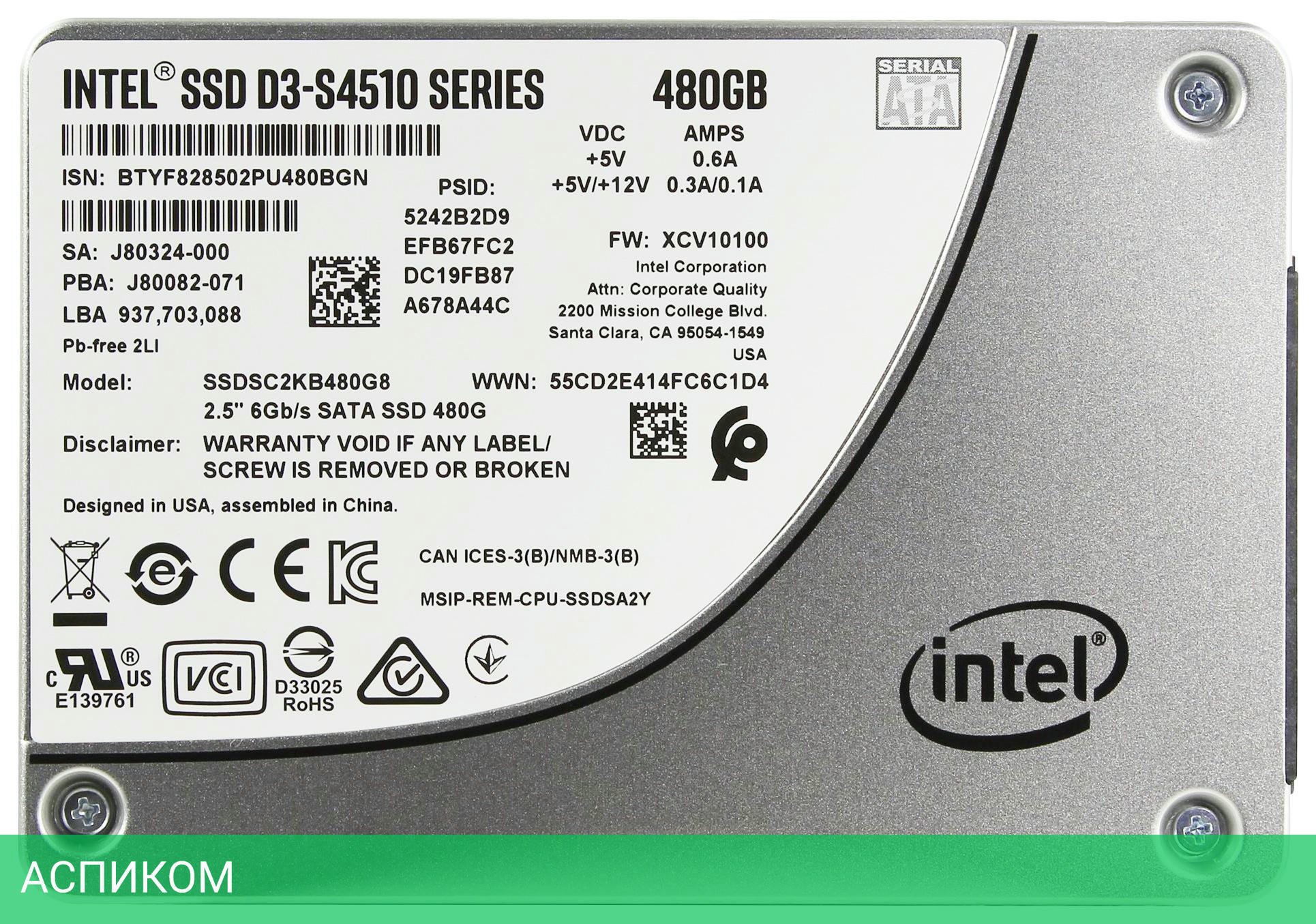 SSD диск Intel Original 480GB D3-S4510 (SSDSC2KB480G801)/2.5"/480 ГБ/SATA/560MBs/490MBs/95K IOPS/18K IOPS/2M MTBF/3D TLC NAND