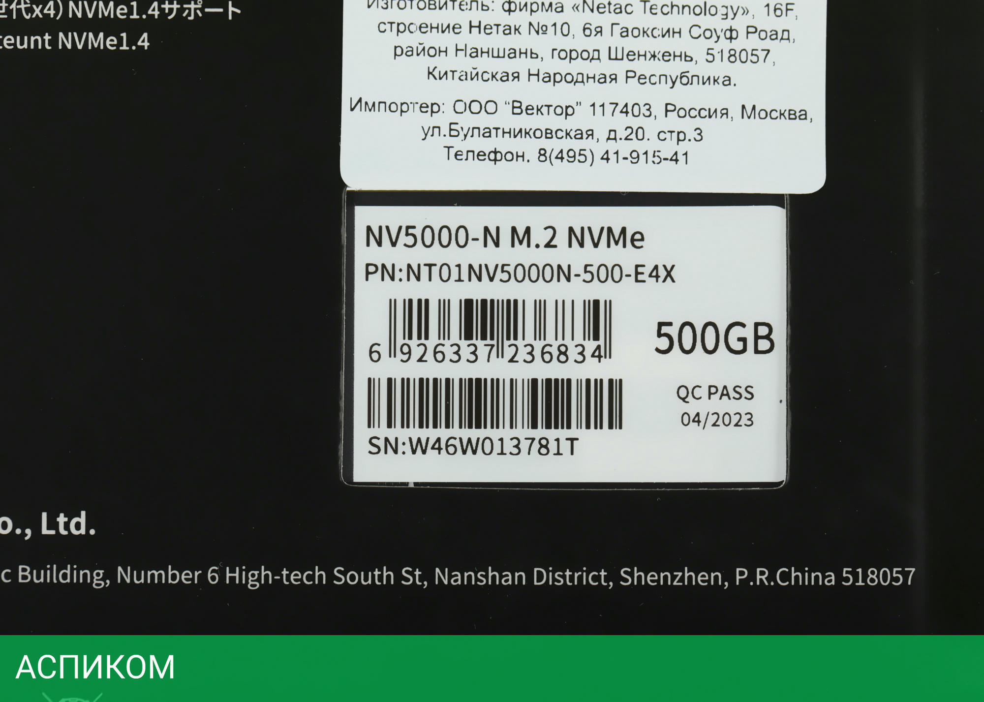 SSD диск Netac NT01NV5000N-500-E4X/M.2/500 ГБ/PCI Express 4.0 x4/5000MBs/2800MBs/200K IOPS/440K IOPS/2M MTBF
