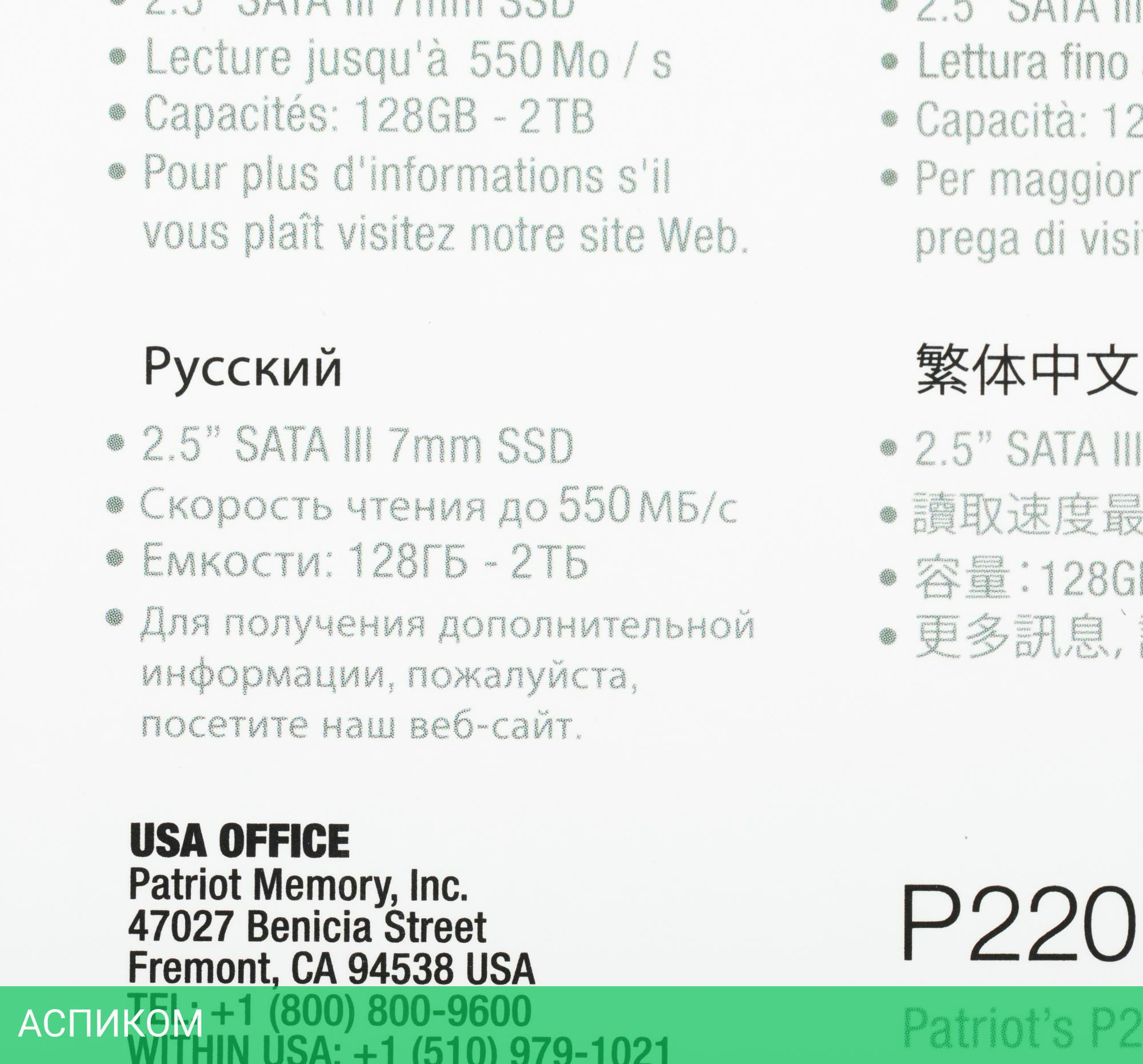 SSD диск Patriot 2Tb P220S2TB25/2.5"/2 ТБ/SATA 3.0 (6Gbps)/550MBs/500MBs/50K IOPS/50K IOPS/3D TLC NAND