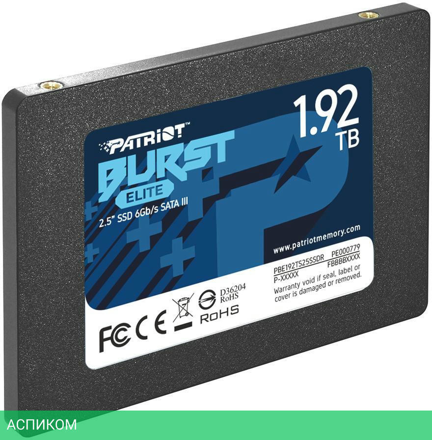 SSD диск Patriot Burst Elite 1.92TB (PBE192TS25SSDR)/2.5"/1.92 ТБ/SATA/450MBs/320MBs/40K IOPS/40K IOPS/2M MTBF/3D TLC NAND