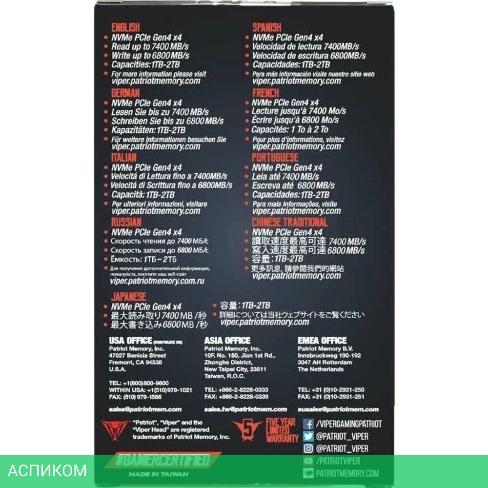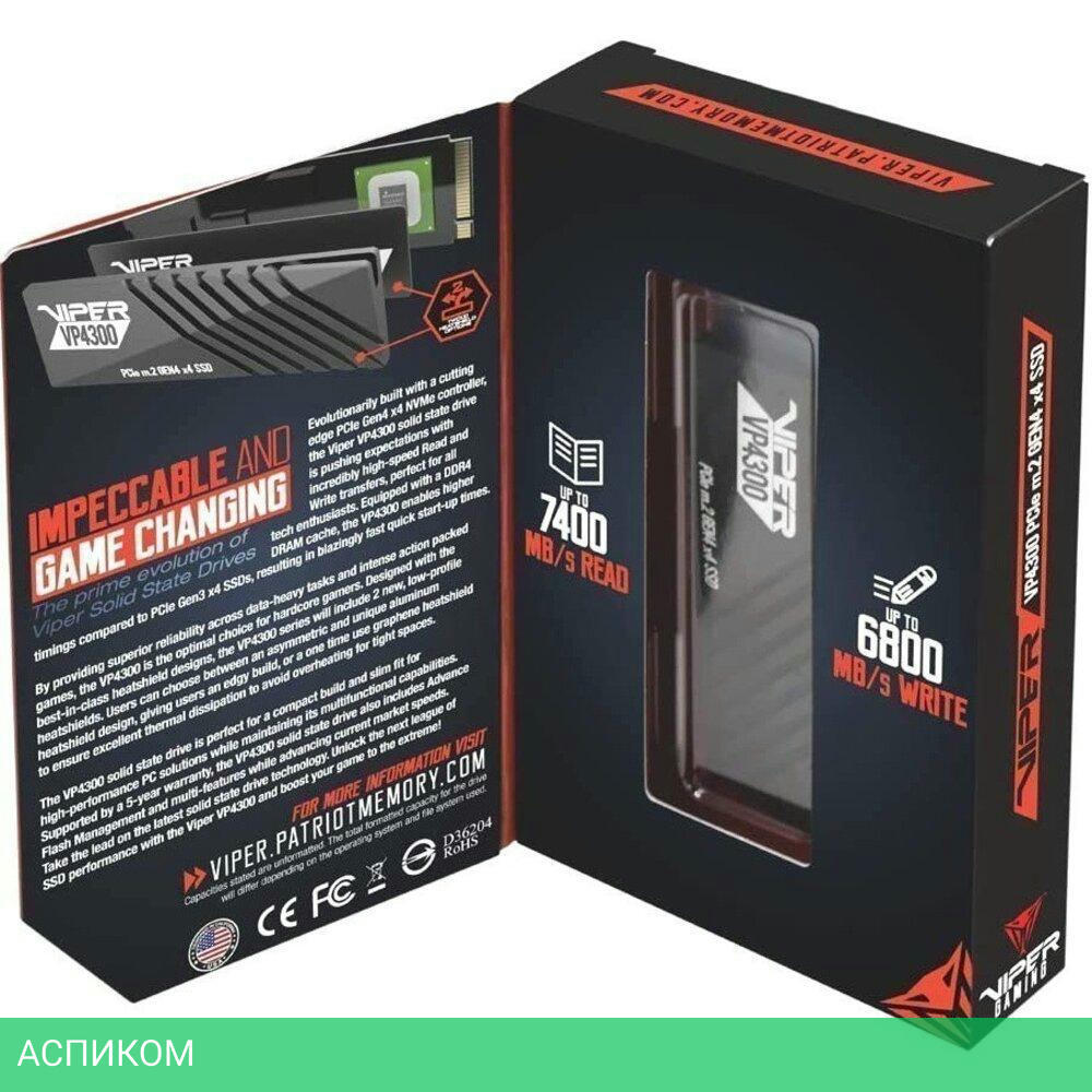 SSD диск Patriot Viper VP4300 1TB (VP4300-1TBM28H)/M.2/1 ТБ/PCI Express 4.0 x4/7400MBs/5500MBs/800K IOPS/800K IOPS/3D TLC NAND