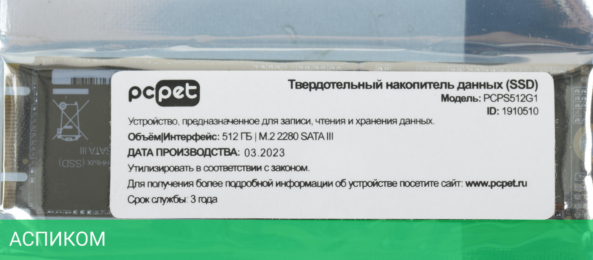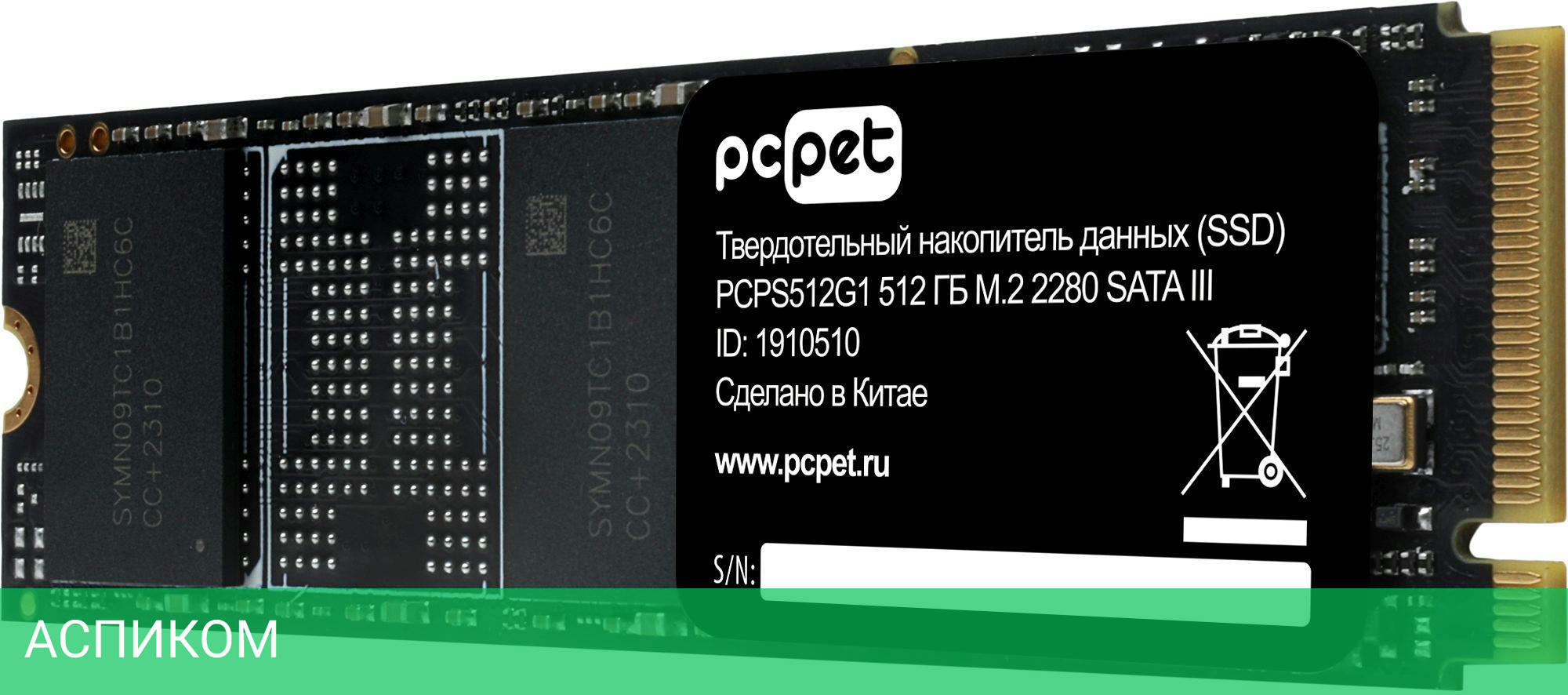 SSD диск PC Pet 512Gb OEM (PCPS512G1)/M.2/512 ГБ/SATA 3.0 (6Gbps)/500MBs/450MBs/1.5M MTBF/OEM