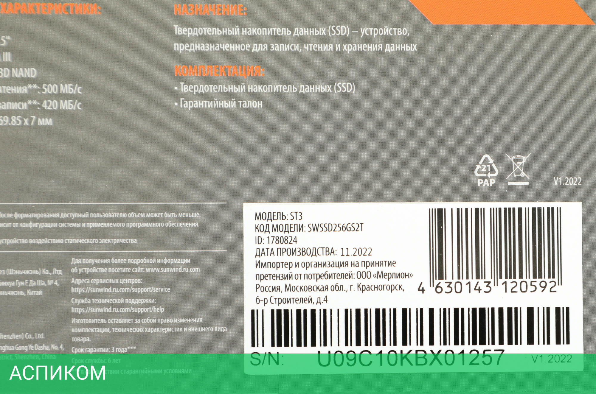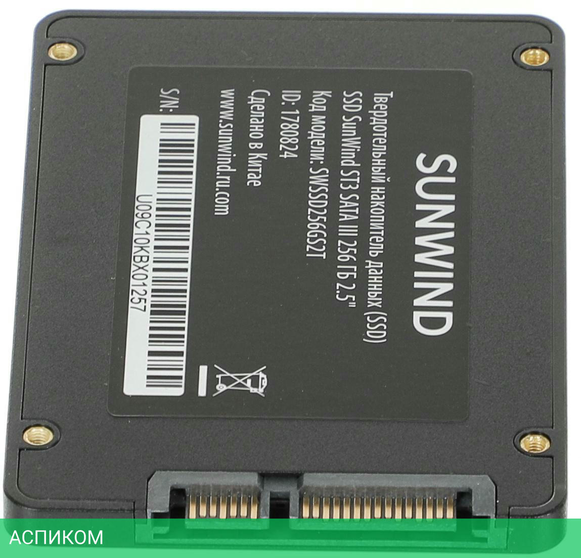 SSD диск SunWind ST3 256GB (SWSSD256GS2T)/2.5"/256 ГБ/SATA 3.0 (6Gbps)/500MBs/420MBs/1.5M MTBF/3D TLC NAND/80TBW/RTL