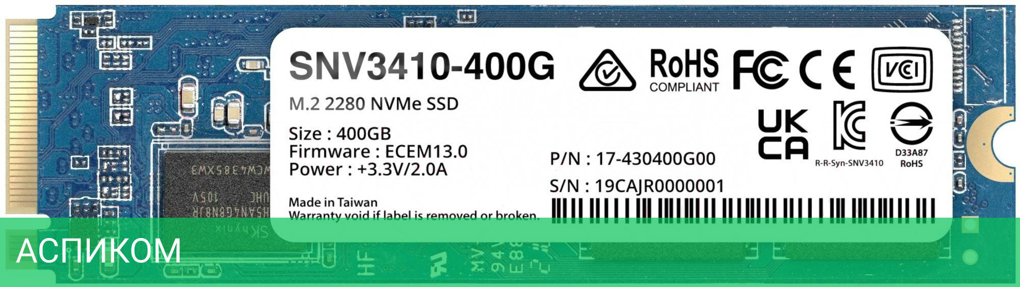 SSD диск Synology SNV3410-400G/M.2/400 ГБ/PCI Express 3.0 x4/3000MBs/750MBs/225K IOPS/45K IOPS