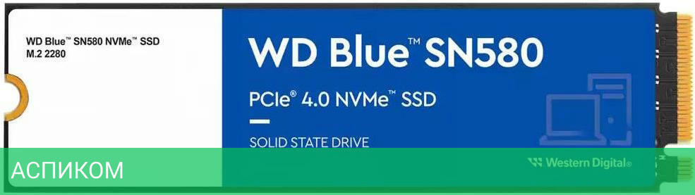 SSD диск WD Blue SN580 250GB (WDS250G3B0E)/M.2/250 ГБ/PCI Express 4.0 x4/4000MBs/2000MBs/240K IOPS/470K IOPS/1.5M MTBF/3D TLC NAND/150TBW/RTL