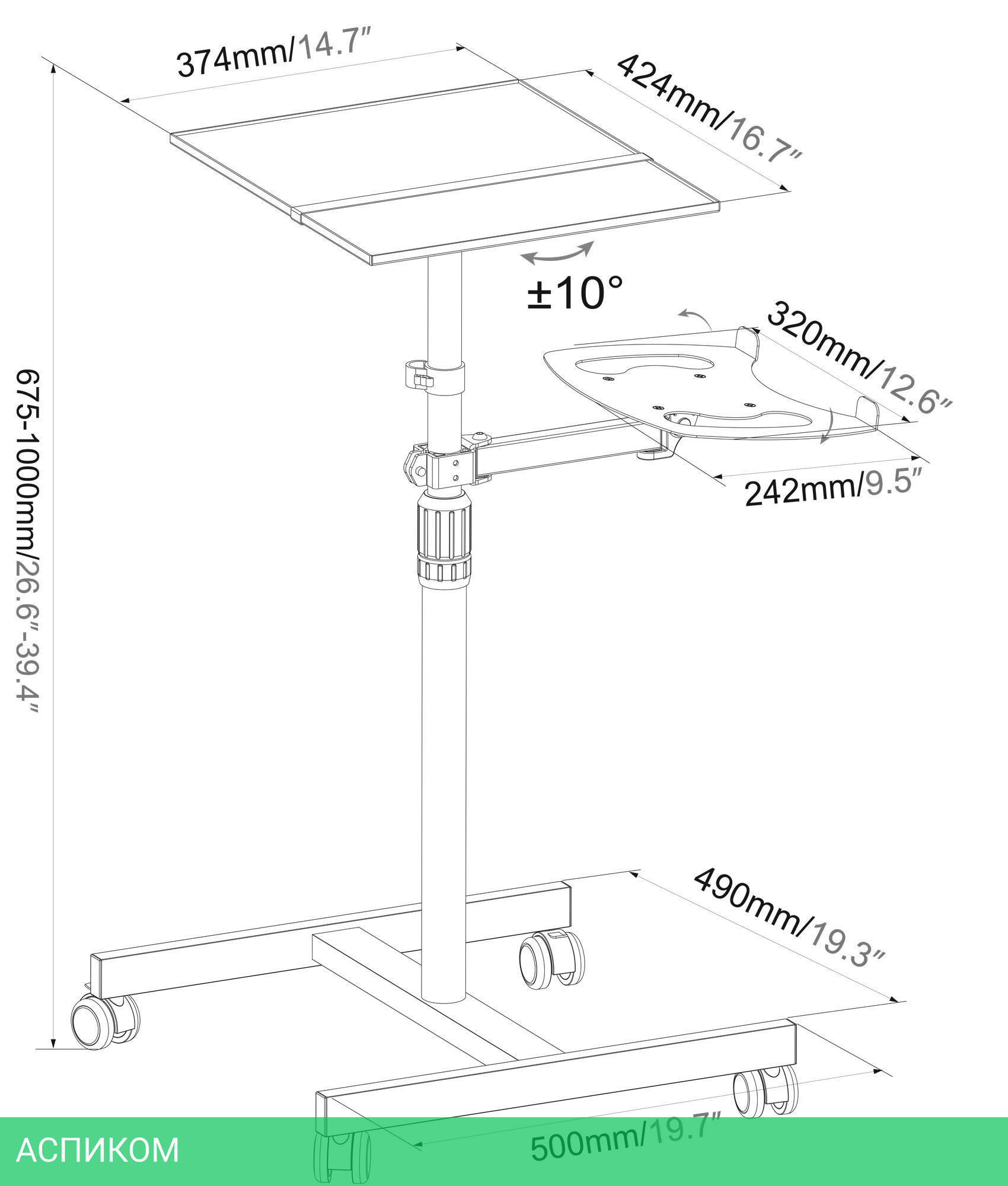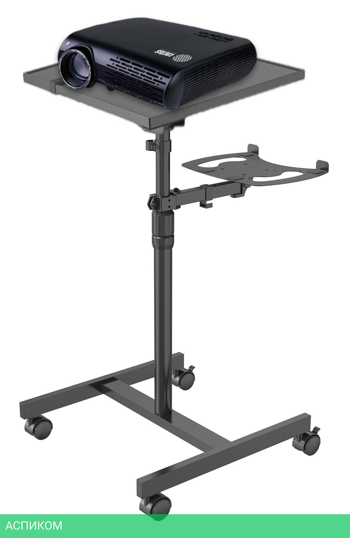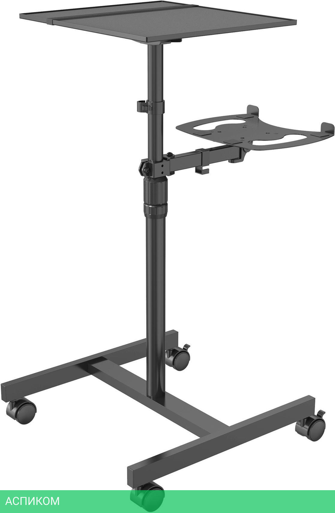 Размер площадки под проектор: 37.4х42.4см. Высота размещения проектора: 67.5-100см. Наличие площадки под ноутбук. Размер площадки под ноутбук: 32х24.2см. Наклон площадки под проектор: +- 10°. Материал корпуса сталь.