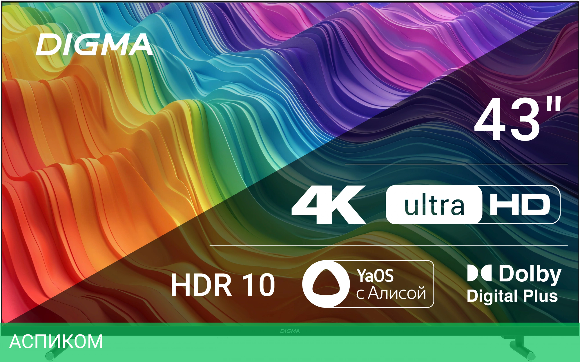 Телевизор Digma DM-LED43UBB33 черный/ЖК/VA/43″/3840x2160 (4K UHD)/60Hz/Frameless/Smart TV/Яндекс.ТВ/Wi-Fi/DVB-С/DVB-S/DVB-S2/DVB-T/DVB-T2/USB 2.0/черный