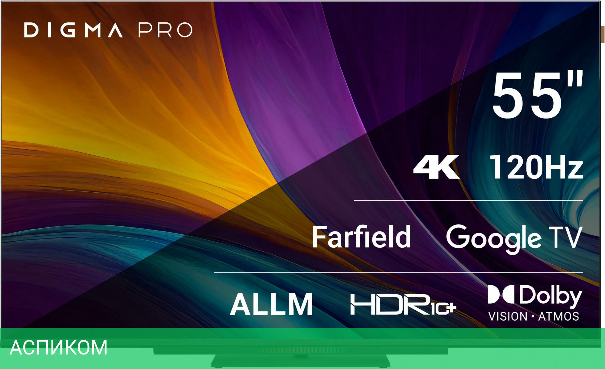 Телевизор Digma Pro 55C черный/ЖК/55″/3840x2160 (4K UHD)/120Hz/Frameless/Smart TV/Google TV/Wi-Fi/DVB-С/DVB-S/DVB-S2/DVB-T/DVB-T2/USB 2.0/черный