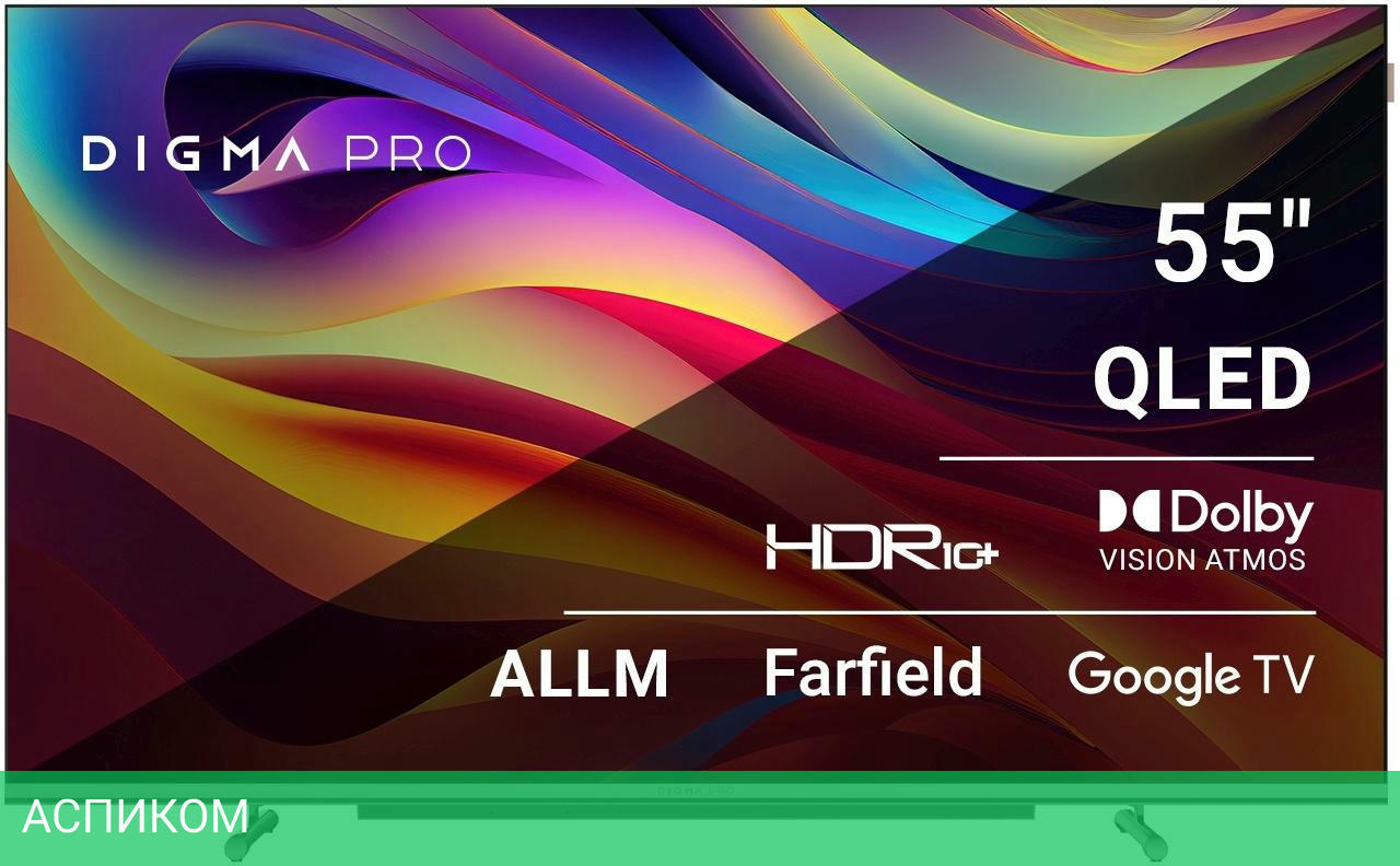 Телевизор Digma Pro 55L черный/серебристый/ЖК/VA/55″/3840x2160 (4K UHD)/120Hz/Frameless/Smart TV/Google TV/Wi-Fi/DVB-С/DVB-S/DVB-S2/DVB-T/DVB-T2/USB 2.0/черный