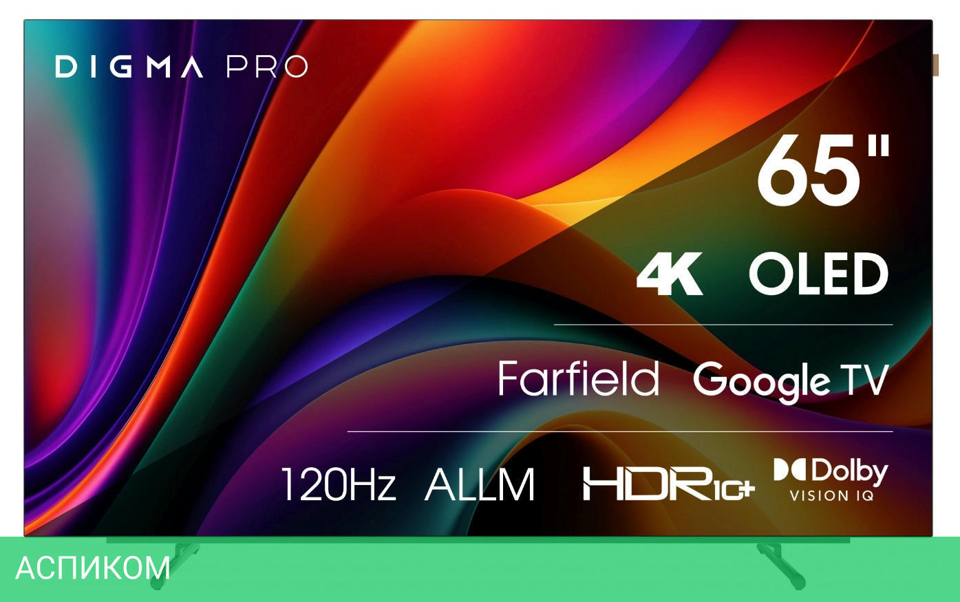 Телевизор Digma Pro 65M черный/серебристый/OLED/OLED/65″/3840x2160 (4K UHD)/120Hz/Frameless/Smart TV/Google TV/BT/Wi-Fi/DVB-C/DVB-S/DVB-S2/DVB-T/DVB-T2/USB Type-A/черный