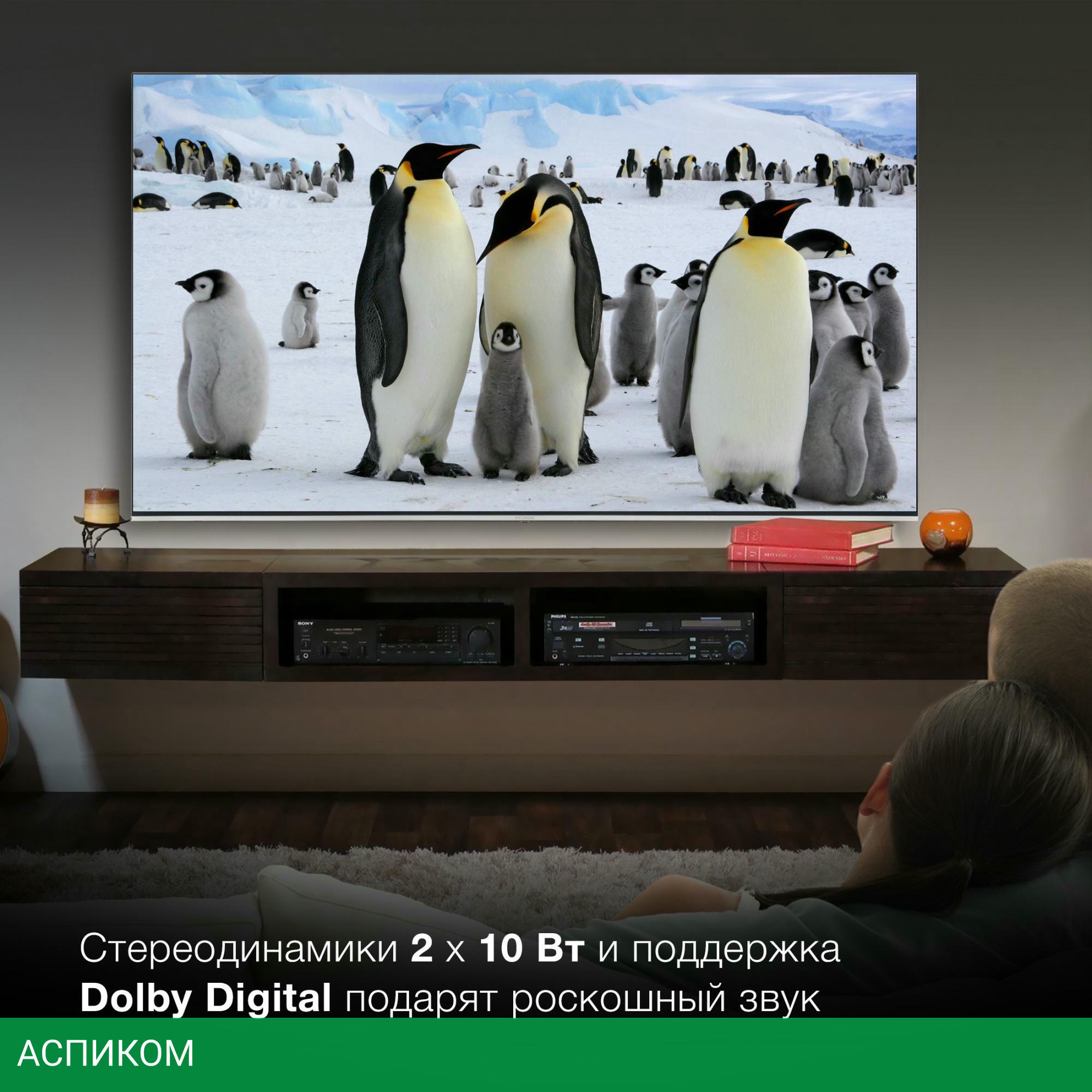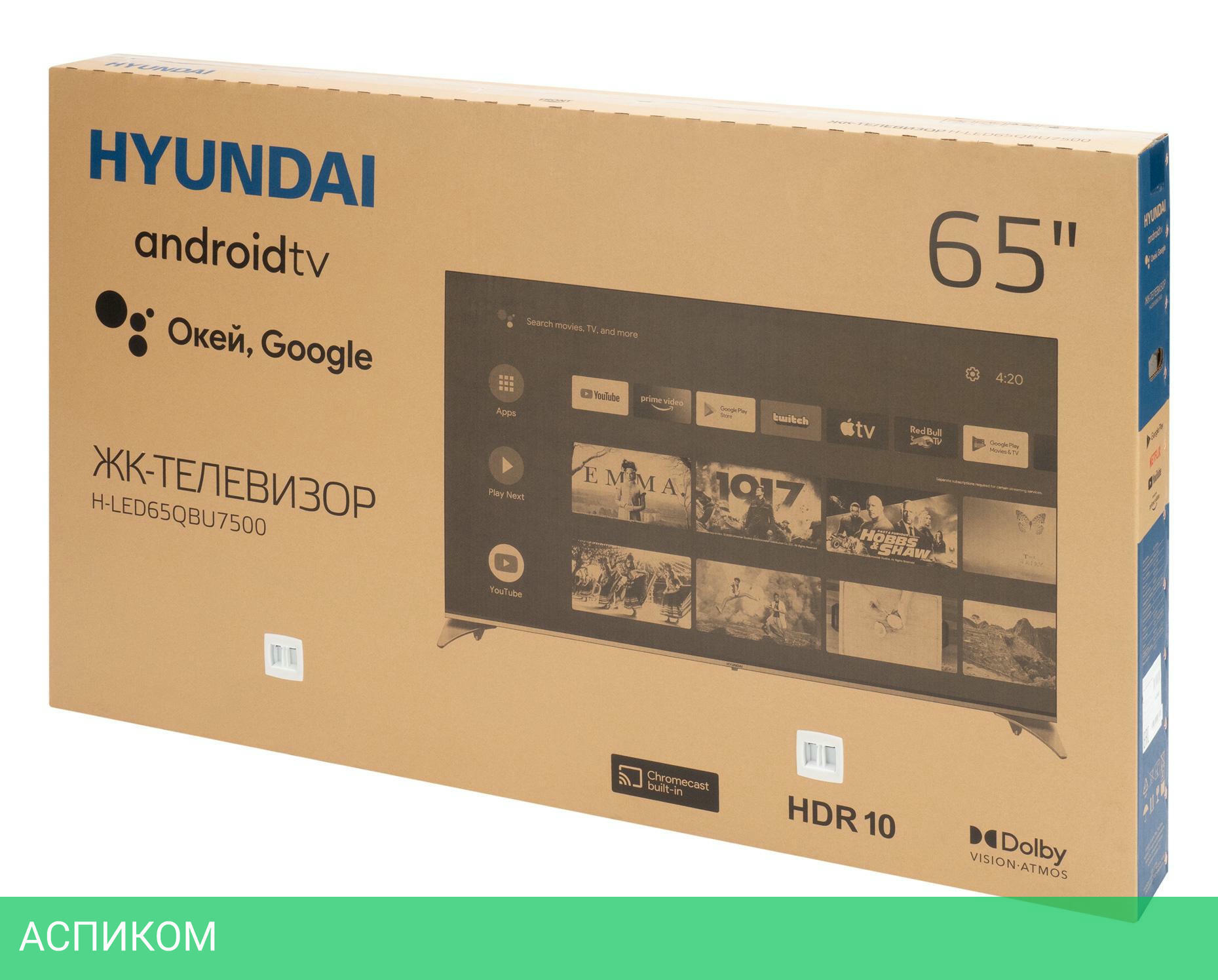 Телевизор Hyundai H-LED65QBU7500 черный/ЖК/OLED/65″/3840x2160 (4K UHD)/60Hz/Frameless/Smart TV/Android TV/BT/Wi-Fi/DVB-C/DVB-S/DVB-S2/DVB-T/DVB-T2/USB 2.0/черный