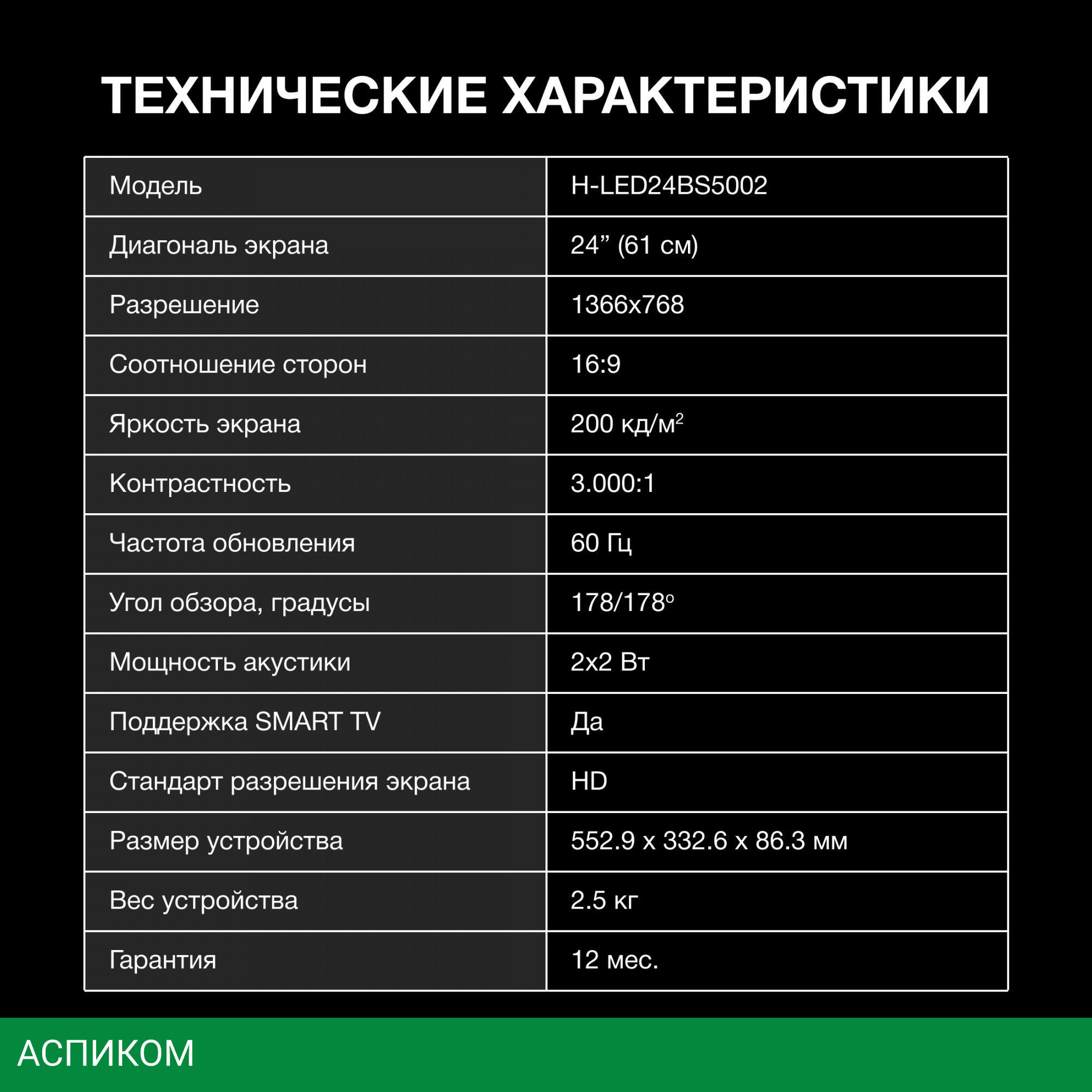 Также данная модель поддерживает возможность использования в качестве внешнего монитора. Для этого в неё интегрировано два порта HDMI, а для чтения мультимедийного контента с флеш-накопителей памяти Hyundai H-LED24BS5002 применяет встроенный USB-разъём. За объёмный и качественный звук в девайсе отвечает пара колонок с суммарной мощностью 4 Вт.