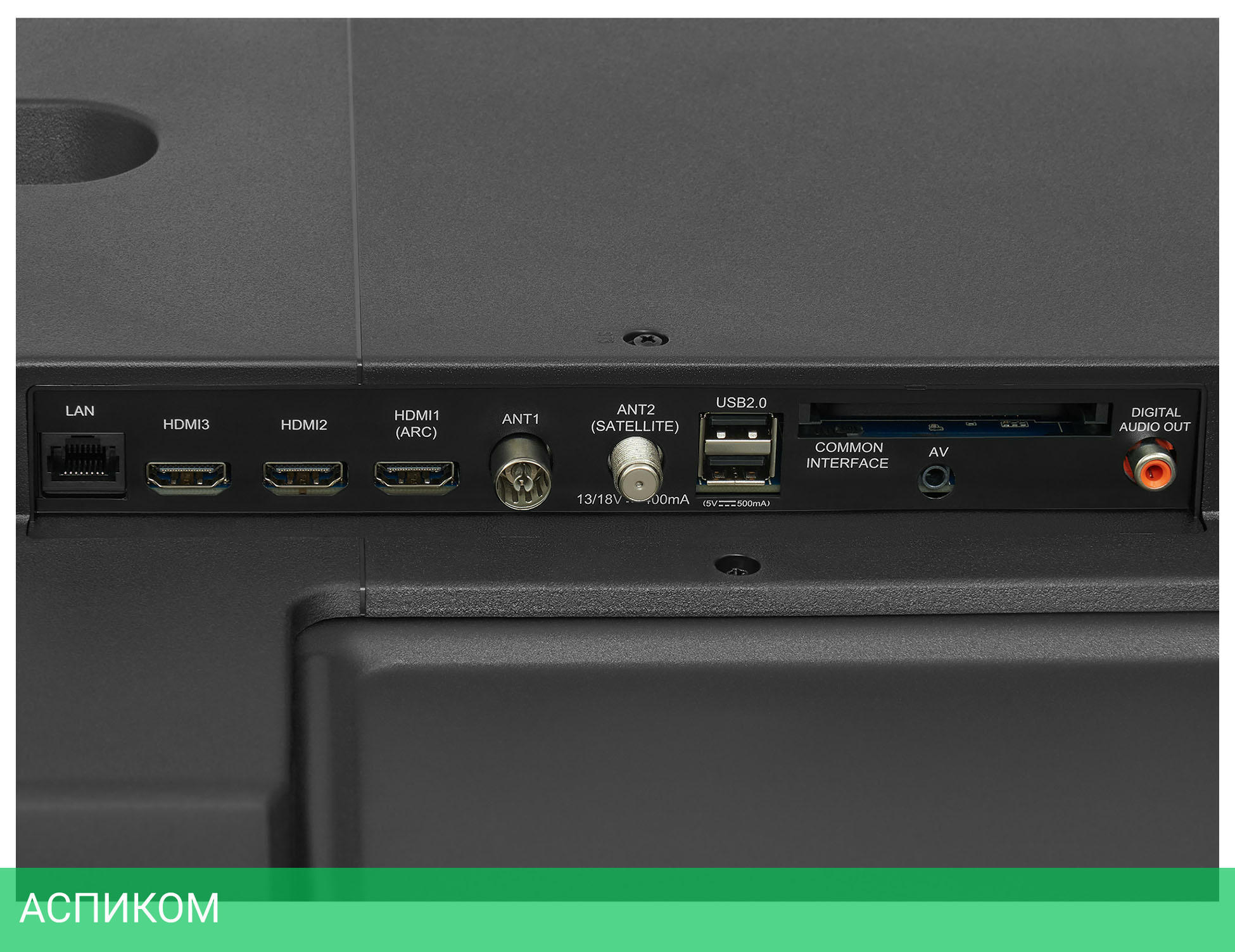 Одна из главных особенностей данной модели – поддержка управления интерфейсом с помощью голосовых команд для виртуального ассистента. Она стала возможной благодаря использованию на устройстве современной ОС Android с оболочкой «Салют ТВ», полностью переведенной на русский язык. Чтобы активировать голосовое управление, достаточно нажать кнопку, отвечающую за встроенный микрофон на пульте ДУ.