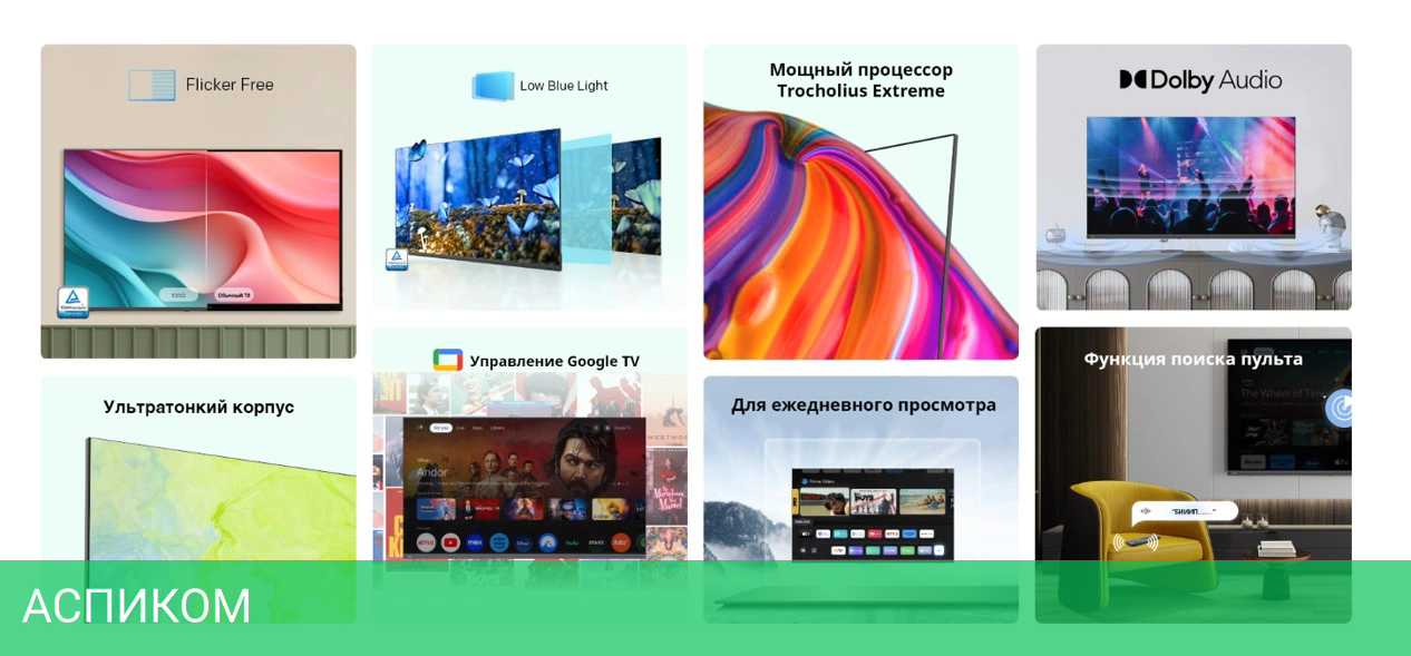 Технологии защиты зрения: Low Blue Light (сниженный синий свет), Flicker Free (антимерцание), Функция поиска ПДУ, Антибактериальный ПДУ