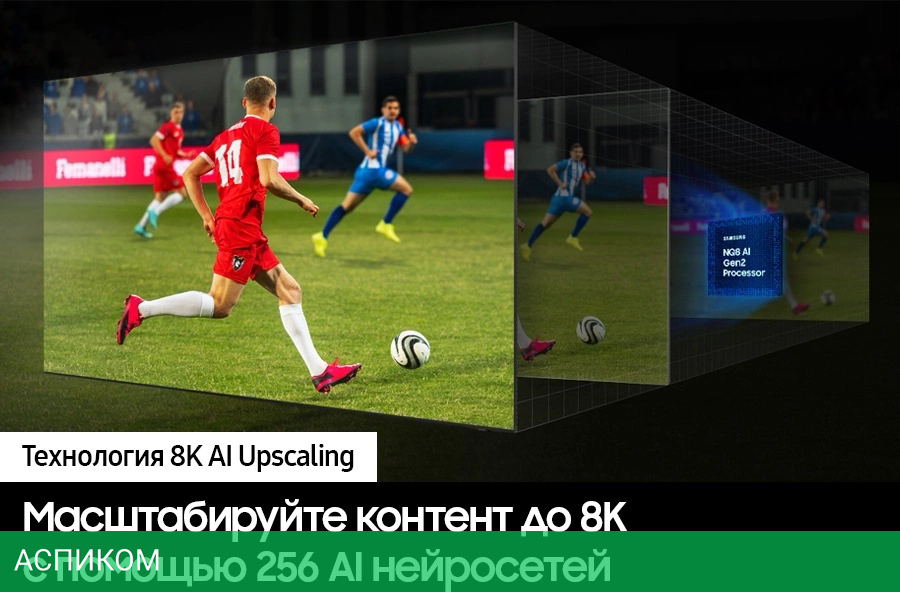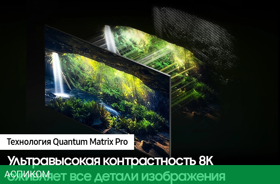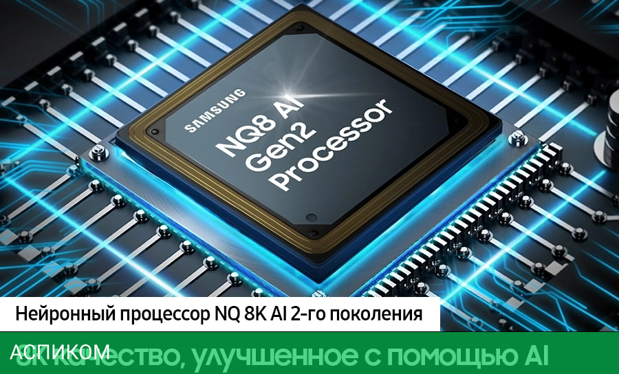 процессор Neo Quantum 8K; расширенный динамический диапазон Quantum HDR 32x; динамическая контрастность Quantum Matrix Pro; тип затемнения Ultimate 8K Dimming Pro; звук, следующий за объектом на экране, OTS+; поддержка проигрывателя и камеры 360 VR; игровые режимы ALLM / VRR / FreeSync Premium P