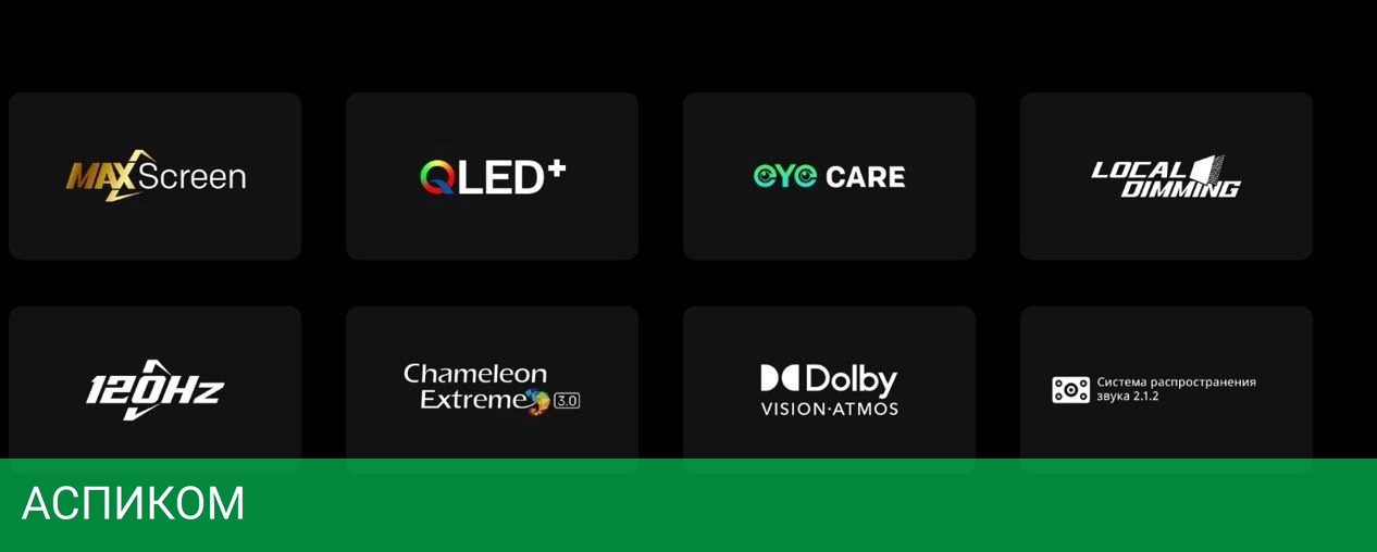 Экран 100 дюймов Мах Screen, Металлический Корпус, Рамка и Подставка глубокого сиреневого цвета, Local Dimming, Технология MEMC, Технология VRR, Антибактериальный ПДУ, Режим Кинопроизводителя, Технологии защиты зрения: Low Blue Light (сниженный синий свет), Flicker Free (антимерцание), Ночной Режим