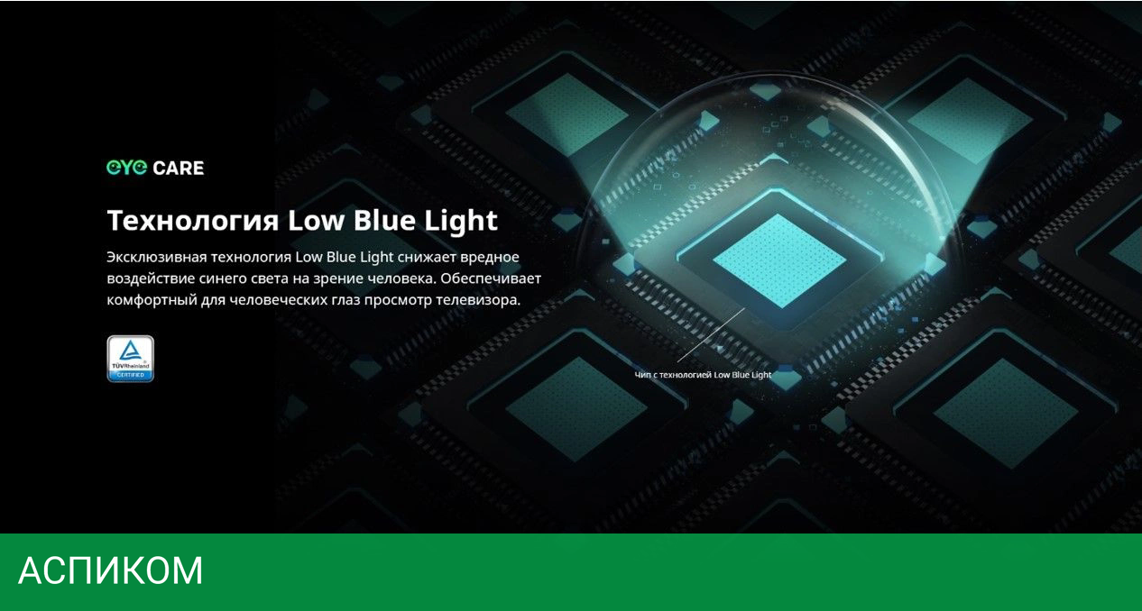 Матовый Экран, Технологии защиты зрения: Low Blue Light (сниженный синий свет), Flicker Free (антимерцание), Ночной Режим, Датчик окружающего освещения, Функция поиска ПДУ, Антибактериальный ПДУ, Режим Кинопроизводителя