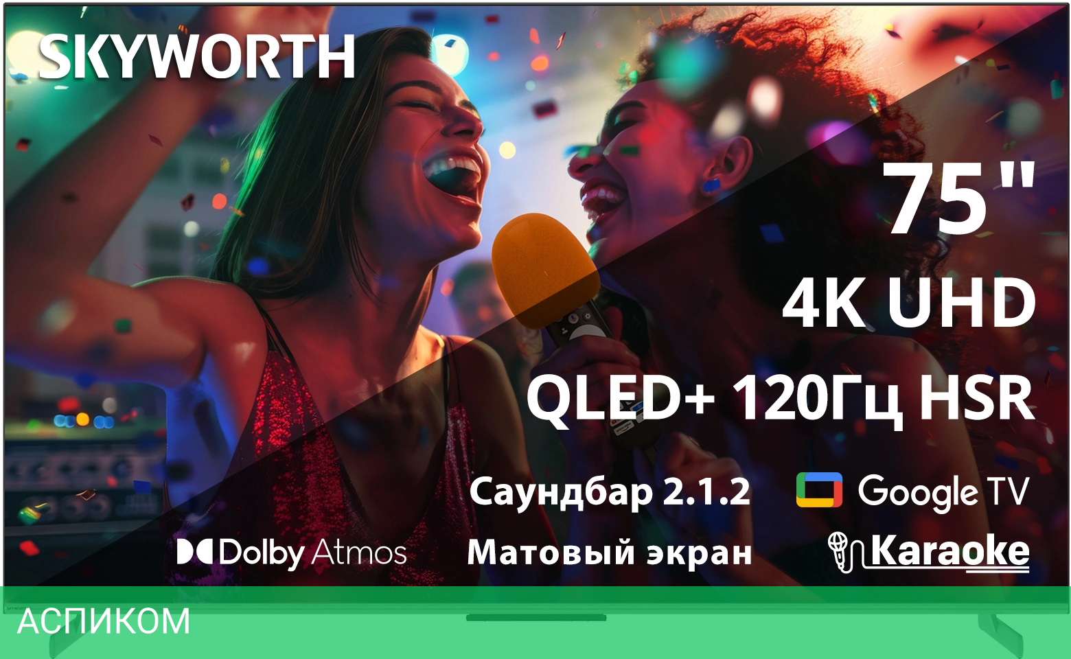 Караоке режим на базе ИИ через пульт ДУ; Встроенный сабвуфер и саундбар; Матовый экран с антибликовым покрытием; Режим Filmmaker Mode; Технологии защиты зрения: Low Blue Light (сниженный синий свет), Flicker Free (антимерцание);