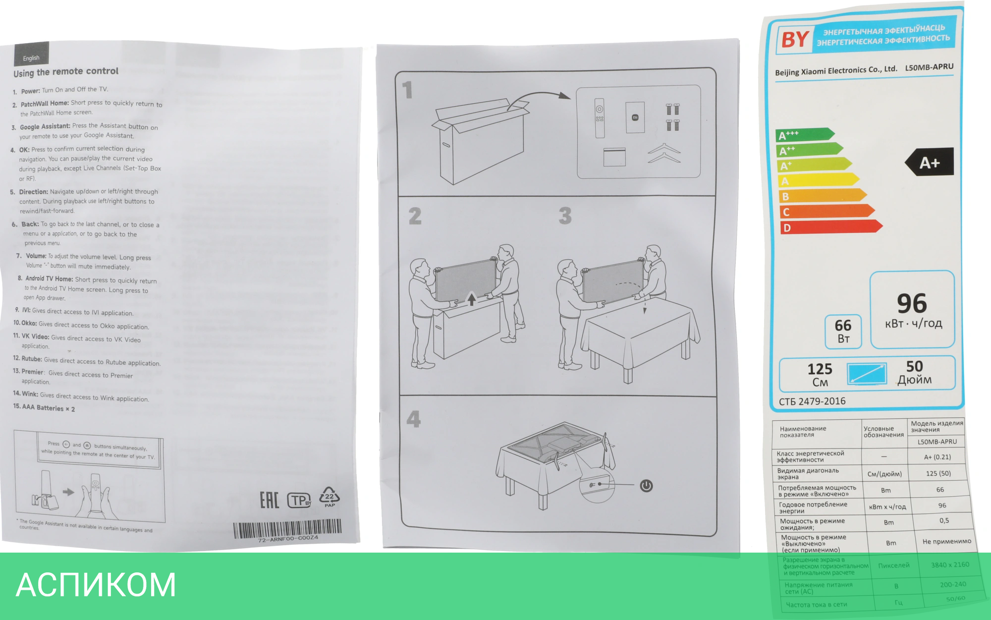 винты, документация, кабель питания, настольная подставка, пульт ДУ