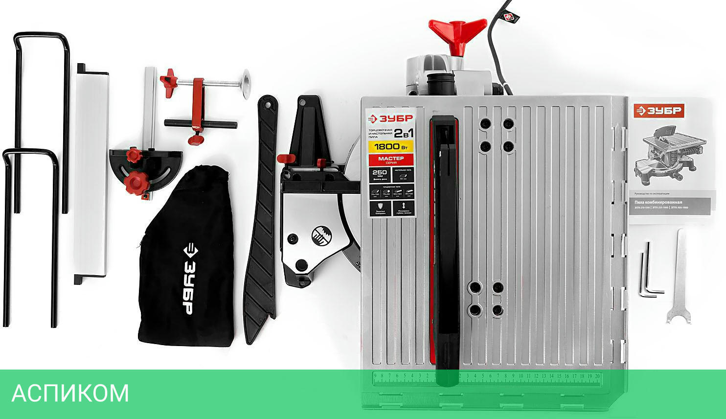 Диск пильный (установлен)Удлинитель стола 2 шт.Продольный упорТолкатель заготовкиКлюч имбусовый 3 штКлюч фланцевыйСтрубцинаВинт-барашекТранспортирМешок для сбора пылиРуководство по безопасности Руководство по эксплуатации