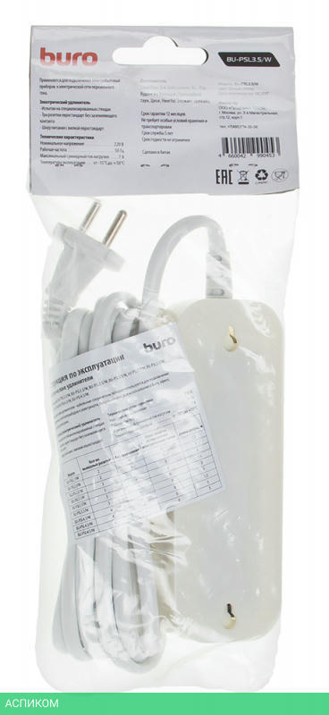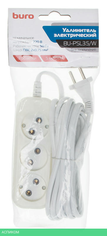 удлинитель / 3 / 5.0 / Schuko (евро без заземления) / белый / Schuko (евро без заземления) / нет / нет / нет
