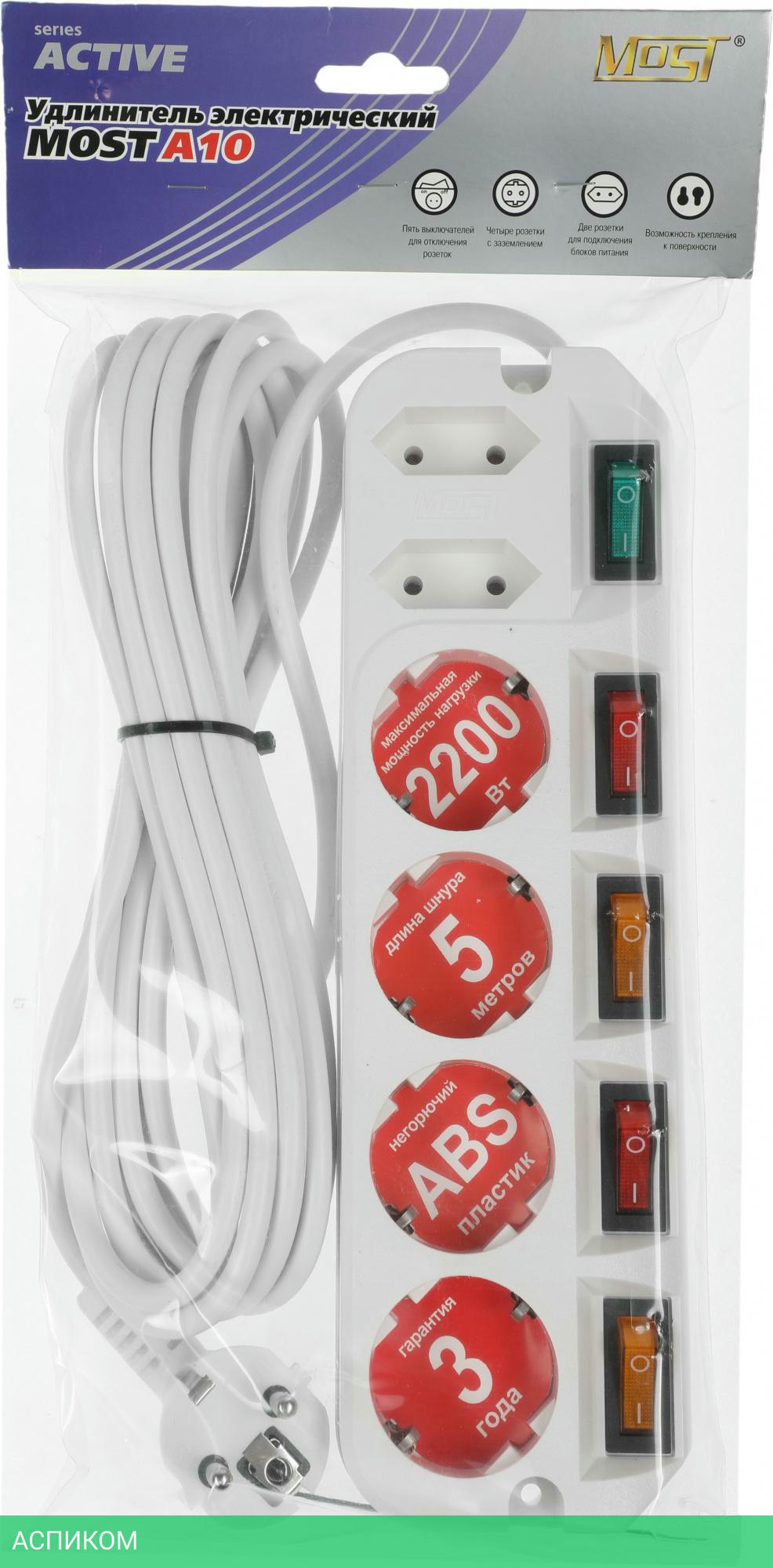 Удлинитель Most А10 предназначен для подключения бытовой техники к сети электропитания.У каждой из четырех евророзеток имеется мощный (16A) индивидуальный выключатель,который обеспечивает удобство обращения с электропитанием и экономит Ваше время. Две узкие розетки имеют общий выключатель.