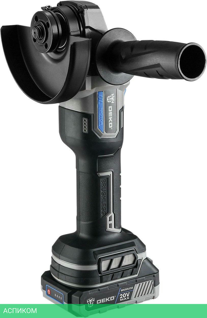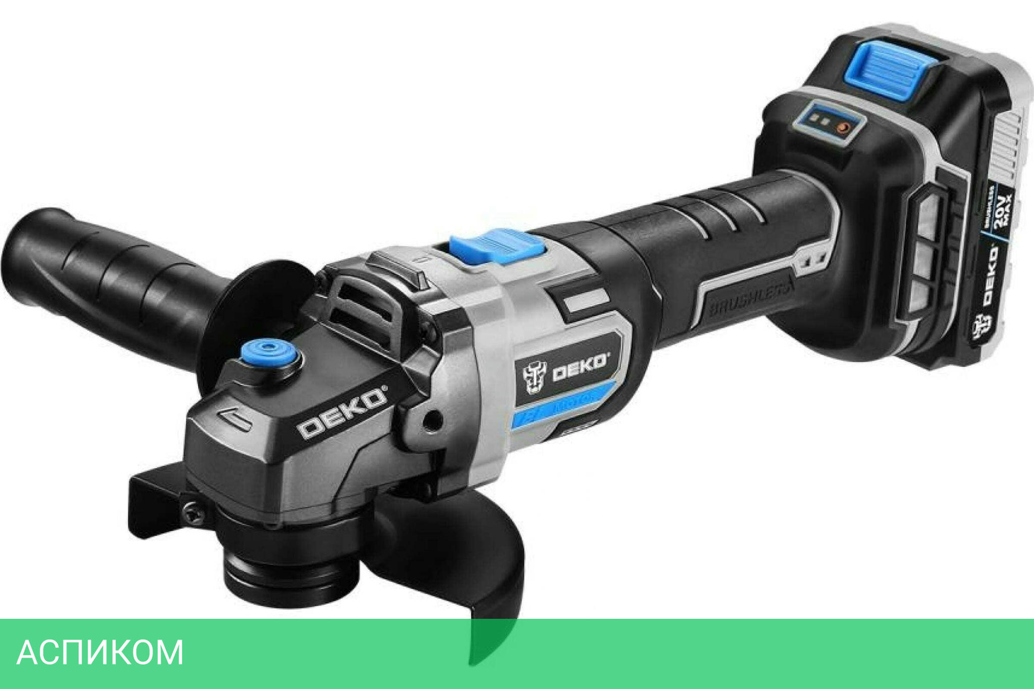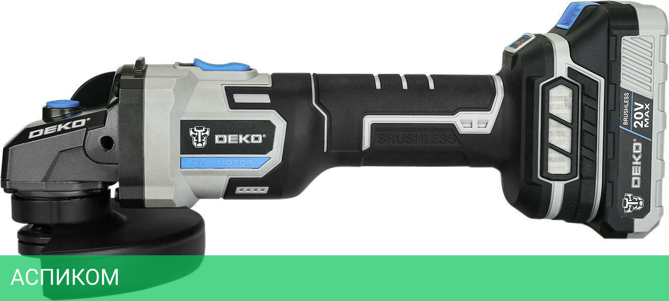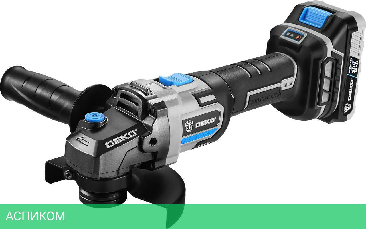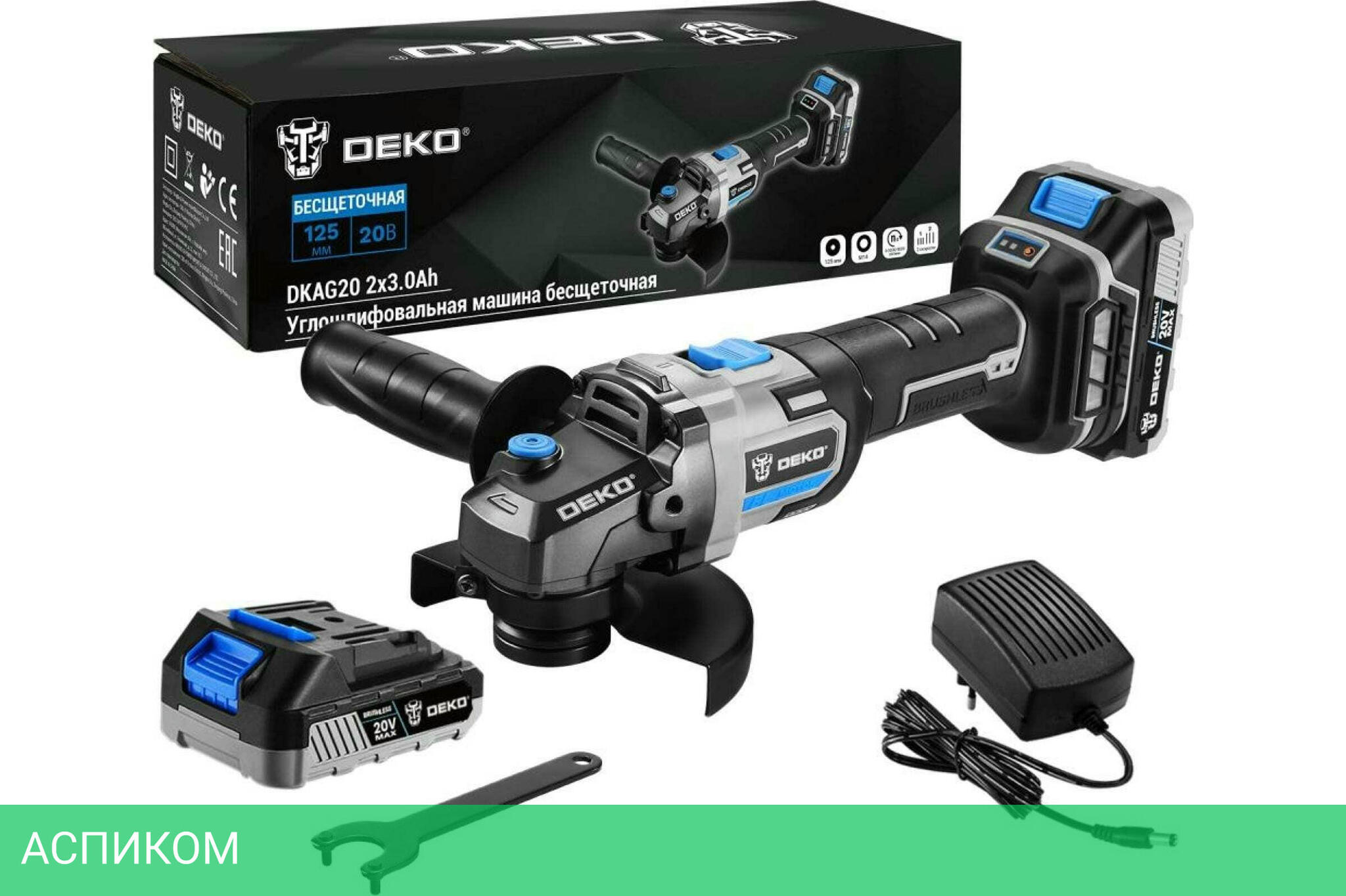 Углошлифовальная машина, аккумулятор - 2 шт., зарядное устройство, гаечный ключ, коробка.