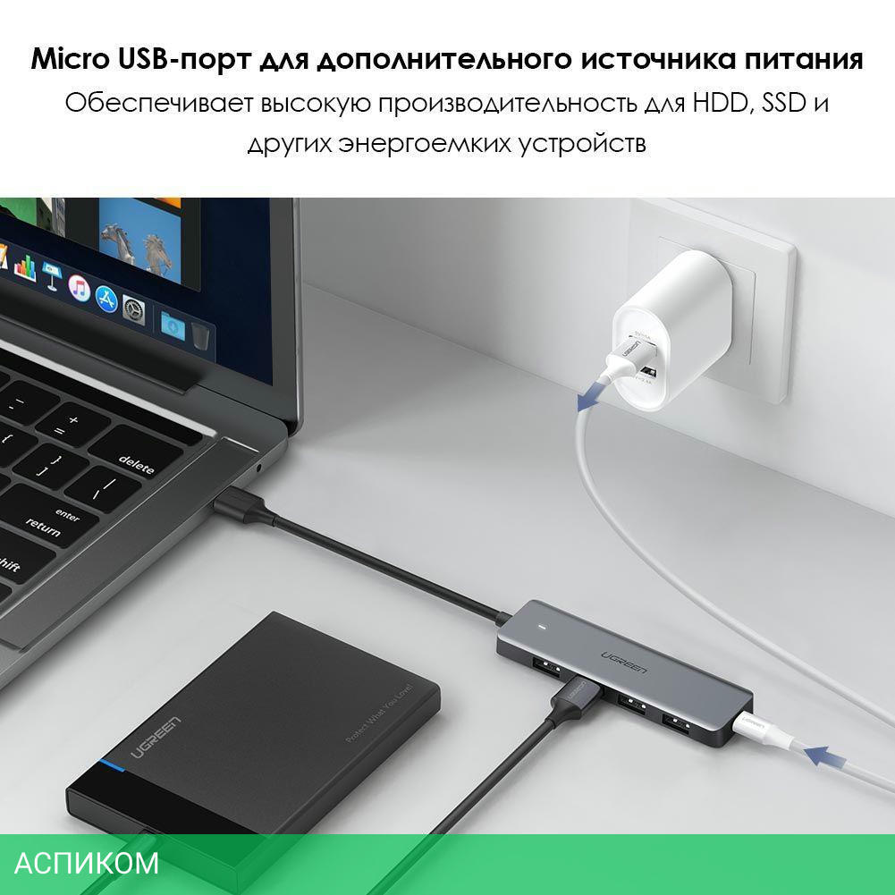 USB-хаб / внешнее / USB 3.2 Gen1 Type-C (5 Гбит/с) / USB Type-A 3.2 Gen1 (5 Гбит/с); micro USB 2.0 / серый / 4 / нет