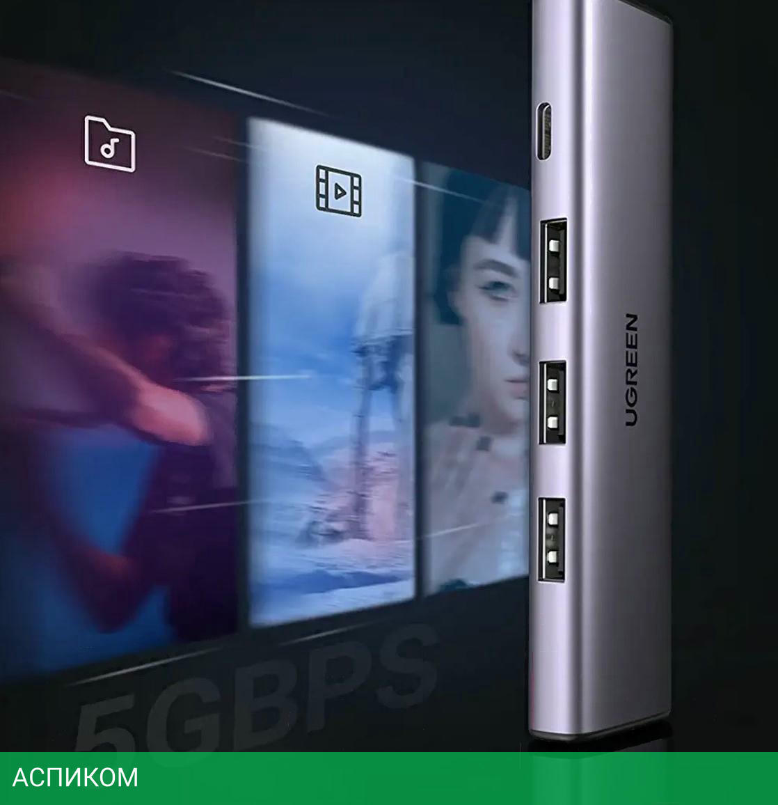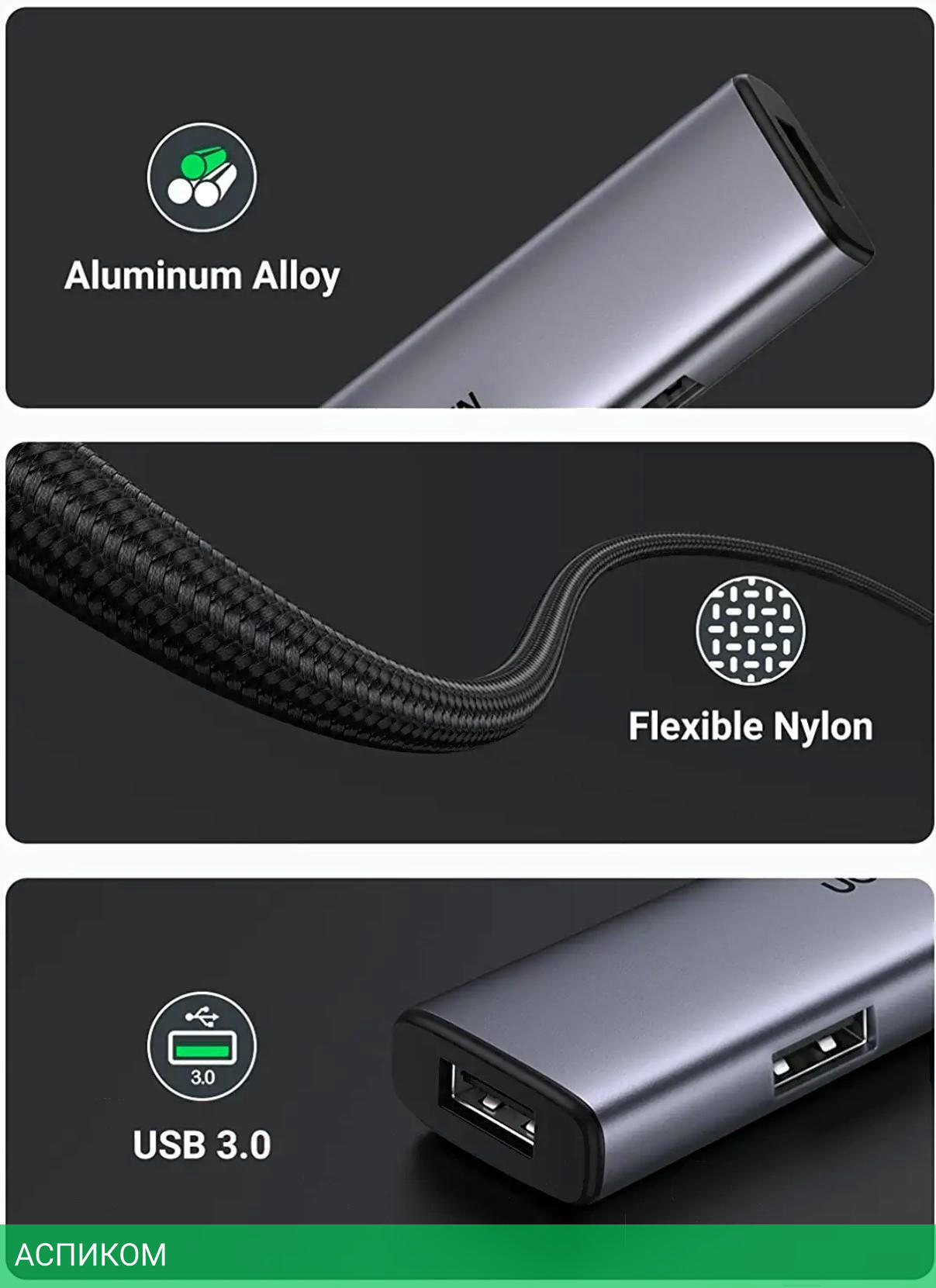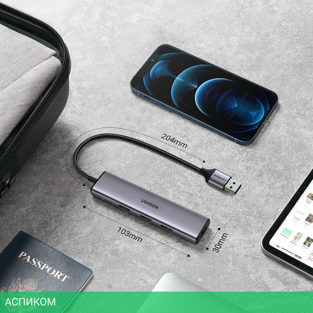 USB-хаб / внешнее / USB 3.2 Gen1 Type-A (5 Гбит/с) / USB Type-C 3.0; USB Type-A 3.2 Gen1 (5 Гбит/с) / серый / 4 / нет