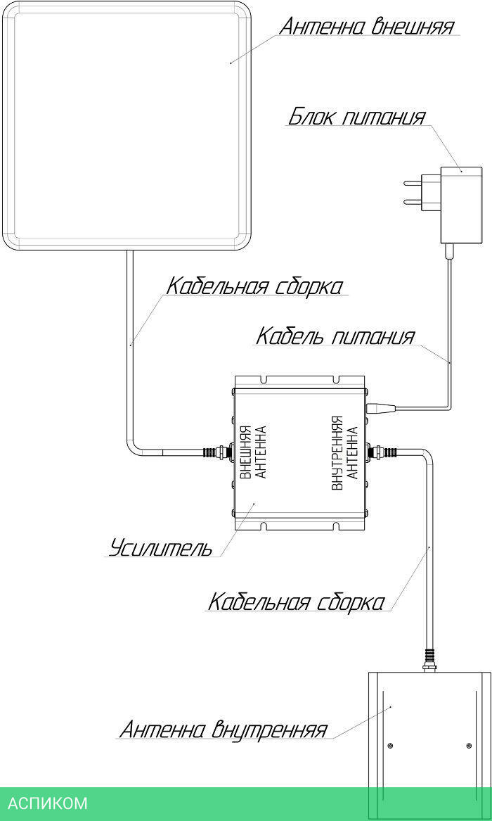 внешняя антенна; усилитель сигнала; внутренняя антенна; кабельные сборки длиной 10 метров — 2 шт; адаптер питания; комплект крепления.