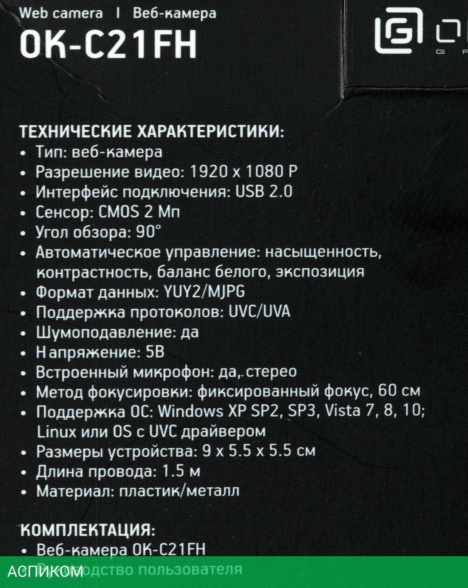 веб-камера / CMOS / 1920x1080 / 2.0 / черный / 30.0 / нет / да / 1.5