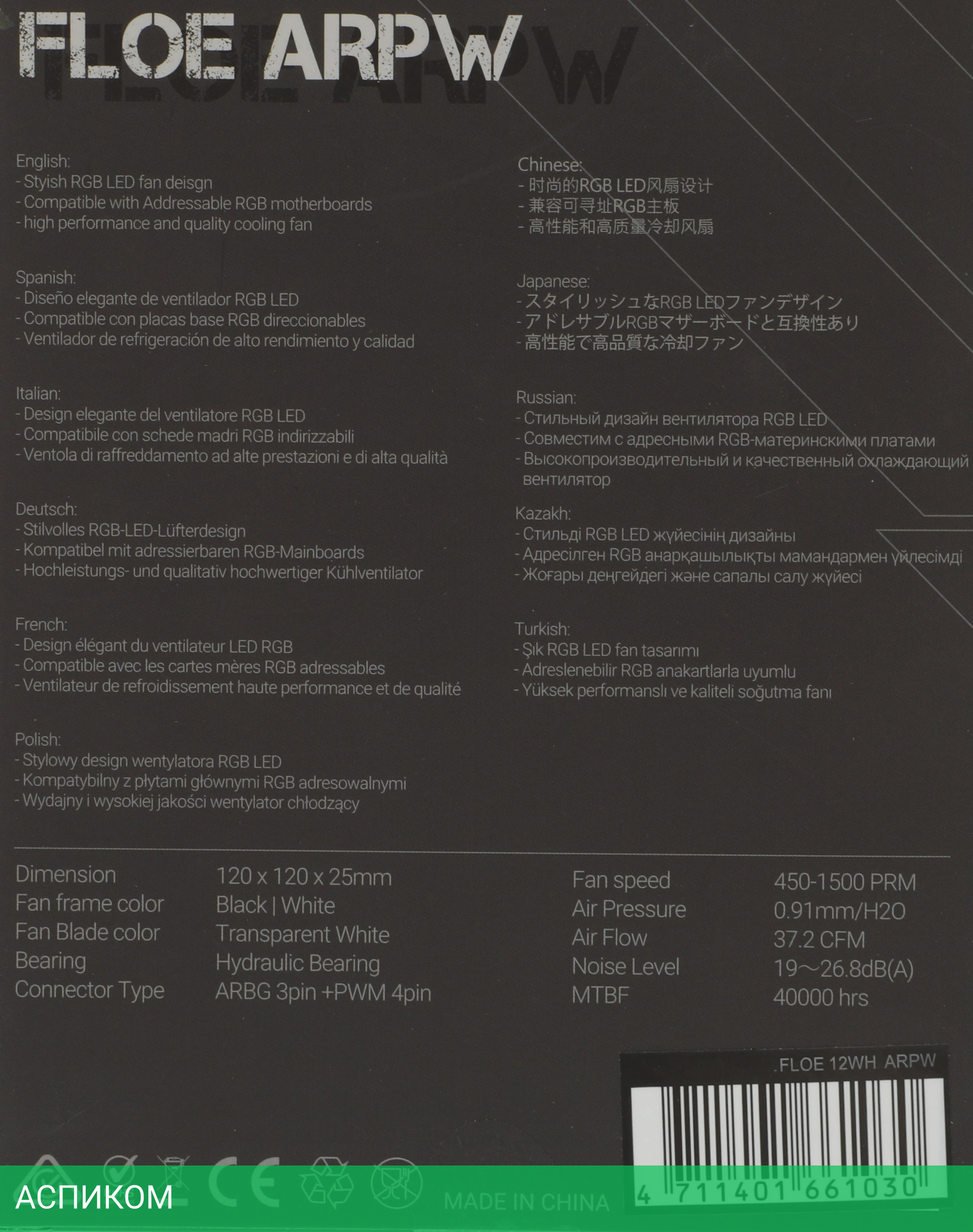 белый / вентилятор / 3.0 / 12.0 / 1500.0 / 120 / гидродинамический (FDB) / да / 18.0