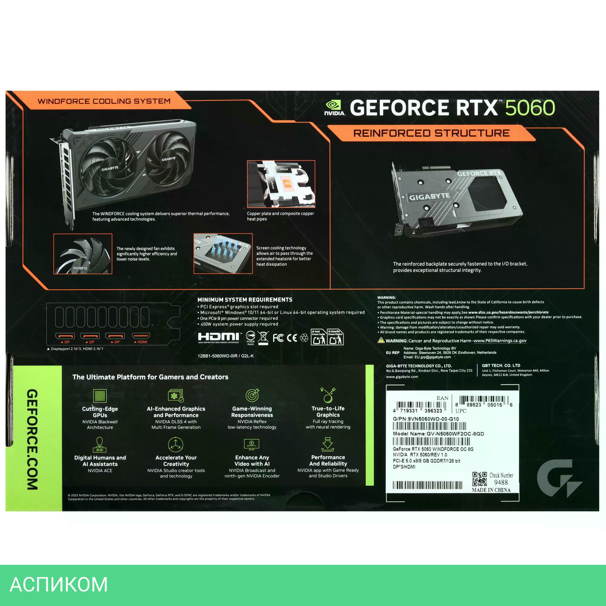NVIDIA / нет / GeForce RTX 5060 / 8.0 / GDDR7 / воздушное / 2 / 8 pin / PCI Express x8 5.0 / 450 / 1 / 3 / 19.9