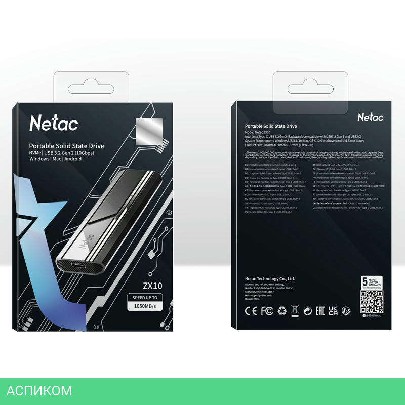 Внешний накопитель Netac ZX10 USB-C 1TB черный (NT01ZX10-001T-32BK)/USB 3.2 Gen2 Type-A (10 Гбит/с), USB 3.2 Gen2 Type-C (10 Гбит/с)/металл