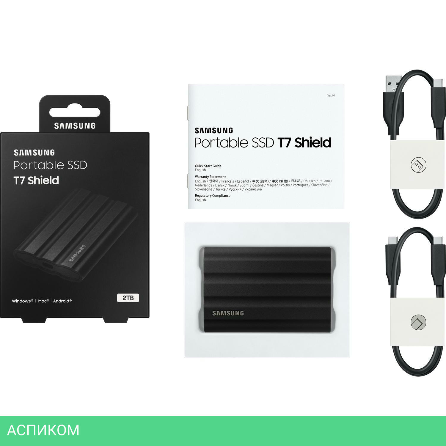 Внешний накопитель Samsung T7 Shield 2TB черный (MU-PE2T0S/WW)/1.8"/USB 3.2 Gen2 Type-A (10 Гбит/с), USB 3.2 Gen2 Type-C (10 Гбит/с)/пластик, резина