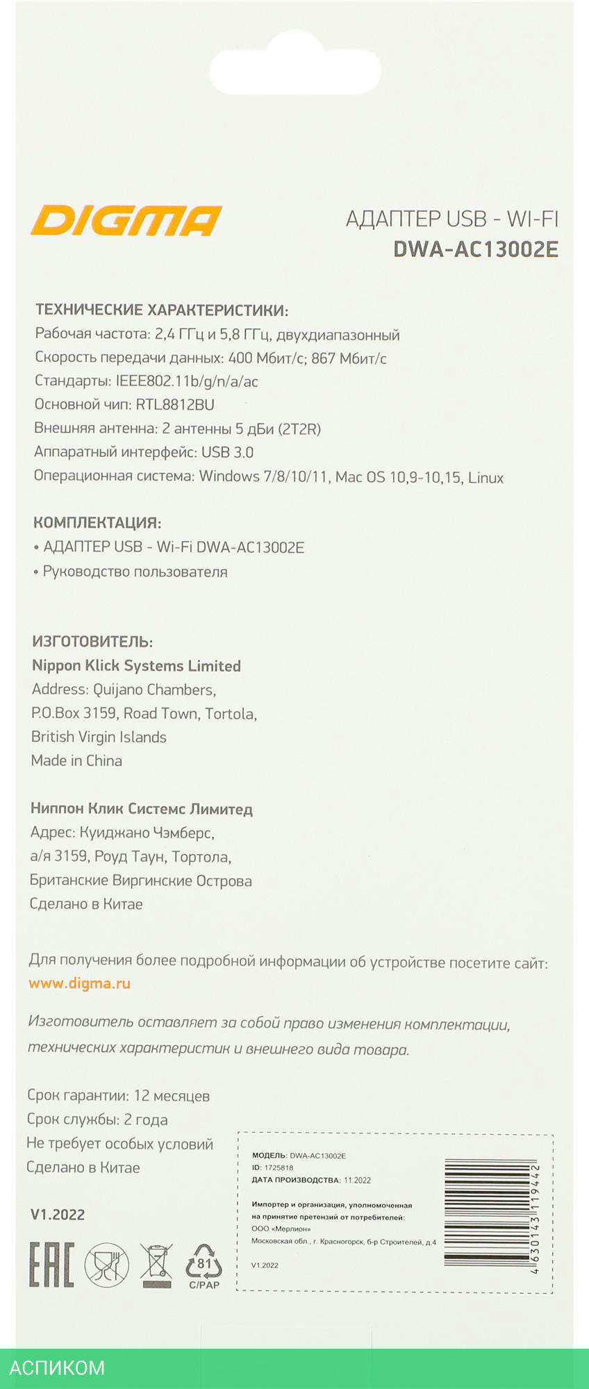 чип RTL8812BU, 2 диапазона 2.4ГГц и 5.8ГГц кабель USB 3.0 длиной 80 см. в комплекте