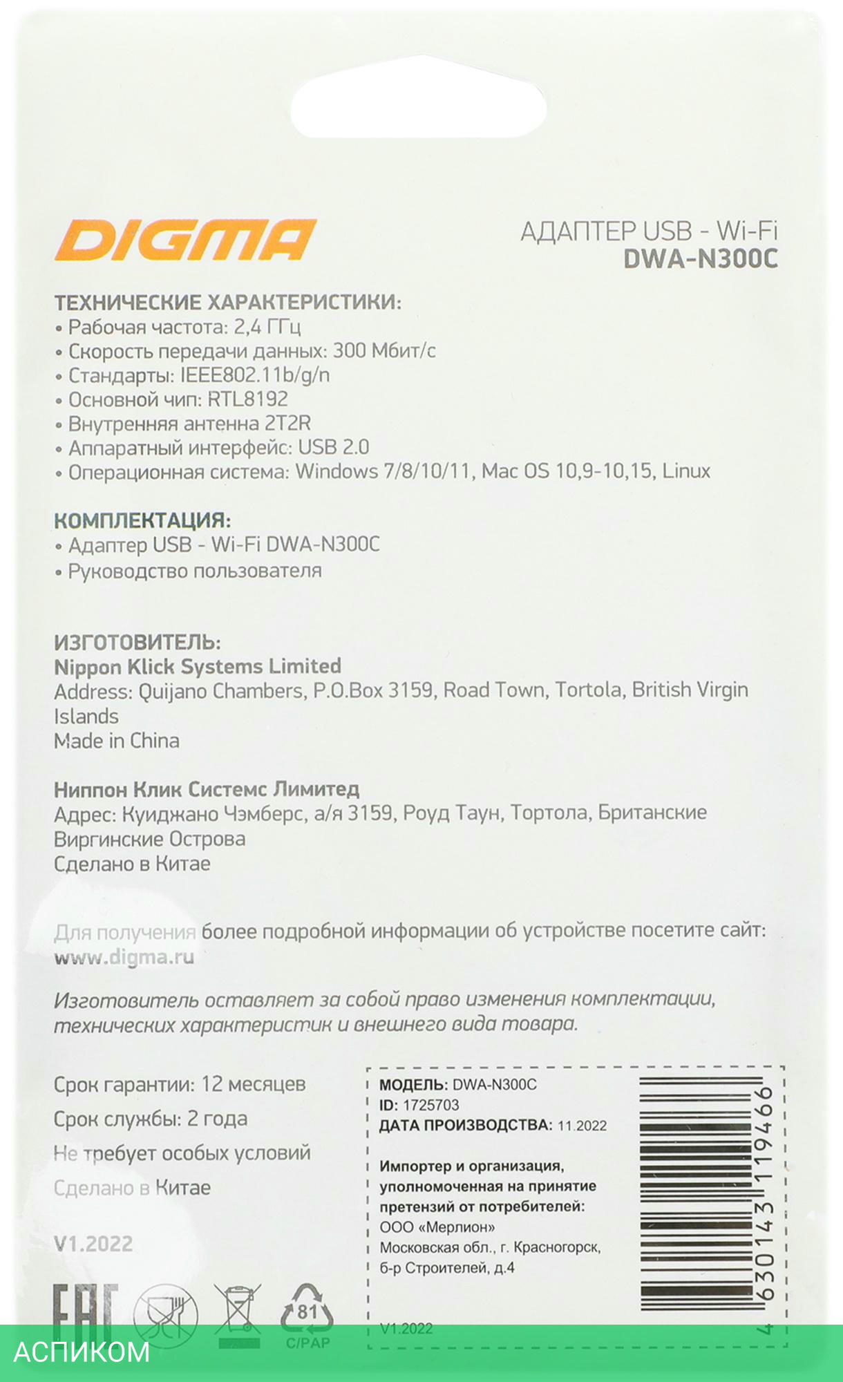 Wi-Fi адаптер / USB 2.0 / 802.11n / 2.4 / 300.0
