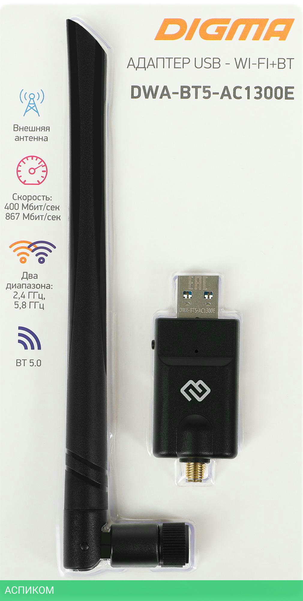 Wi-Fi/Bluetooth адаптер / USB 3.0 / 802.11ac; 802.11n; 802.11a; 802.11g; 802.11b; Bluetooth 5.0 / 2.4; 5 / 1300.0